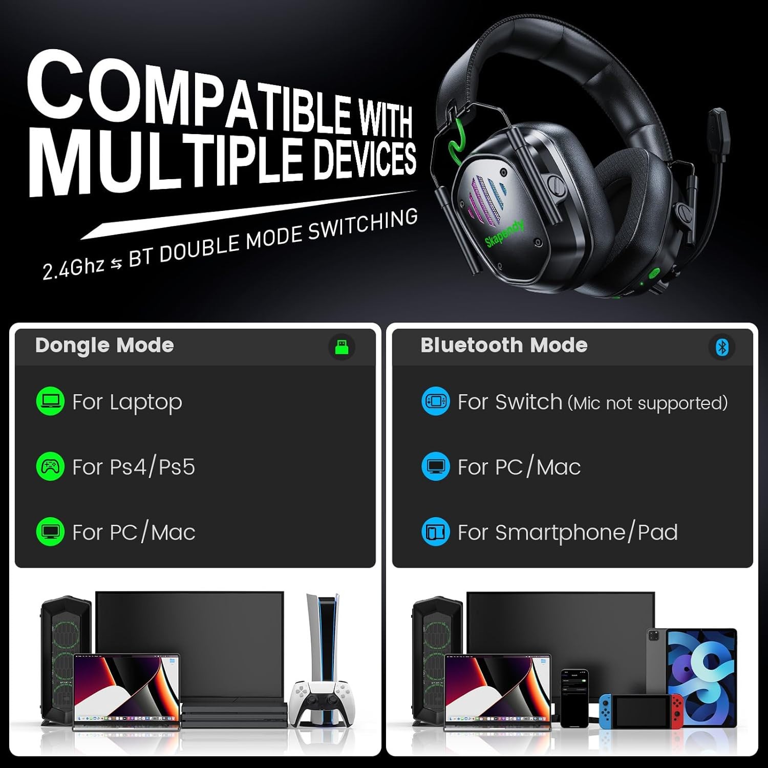 Brand New/Never Opened as packaged by the manufacturer Skapendy VK81 Wireless Gaming Headset Black 50 hour battery life 2.4 GHz About this item đ§ăStereo Surround Sound QualityăExperience gaming like never before with our PC wireless headset, equipped with a 50mm dynamic driver for unparalleled 3D stereo sound. Capture every detailâfrom teammates' voices and footsteps to the sharpest gunshots. Gain a competitive edge with an immersive audio experience that heightens your gaming atmosphere and boosts your chances of victory. The hot headset is perfect gift for Christmas & birthdays, delighting boys, girls, family, and friends alike.đ đŽăMulti-platform CompatibilityăIn 2.4GHz dongle mode, gaming headsets are compatible with Mac, PS5, PS4, Switch, PC, Laptop, Game Boy, surpassing others in performance. By pressing the mic button for 2 seconds, Effortlessly switch to Bluetooth mode, which is compatible with PC, Mac, Switch, mobiles, laptops, tablets.â ď¸Note: Both modes are NOT compatible with Xbox Series.âThe microphone is NOT compatible with Switch.âBluetooth mode is NOT compatible with PS4/PS5. đăStable 2.4G Low Latency Wireless ConnectionăUses ultra-low latency 2.4GHz lossless wireless technology to achieve high-fidelity audio. Equipped with a 2.4GHz USB dongle, it delivers ultra-low latency audio (â¤20ms) for a truly immersive adventure. Effortlessly switch to Bluetooth mode, enjoying swift responsiveness (<48ms). Embrace wireless freedom and precision. Customize your auditory journey for an unrivaled gaming experience. đ§ăErgonomic DesignăSkapendy PC gaming headset adopts foldable design, makes it an ideal choice for travel and daily use for everyone. The earmuffs of this foldable headphones are made of skin-friendly and breathable sponge and leather, and are ergonomically designed (only 0.66lbs in weight),can cushion the pressure on the head and ears and also physically isolate 85% of the noise, for a comfortable experience even when worn for a long time or wearing glasses. đăExceptional Battery LifeăThis PC gaming headset has a 1200mAh battery. Whether you're immersing yourself in music or enjoying long gaming sessions, these headphones will last you all day. Game for hours worry-free with a low battery alarm for timely charging. The 2.5-hour USB-C fast charge time extends to 40 hours with RGB lighting or an impressive 50 hours without RGB. đ§ăSoft RGB LightingăSkapendy wireless headphones are equipped with a cool RGB lighting design. After turning on with the on/off button, the LED lighting effect changes dynamically with the game. Bring your RGB LED fantasies to life with vibrant, eye-catching lights in dim light. Stylish and attractive, soft RGB lighting is a cool complement to video recording and live streaming. Items will be shipped within 24 business hours of payment
