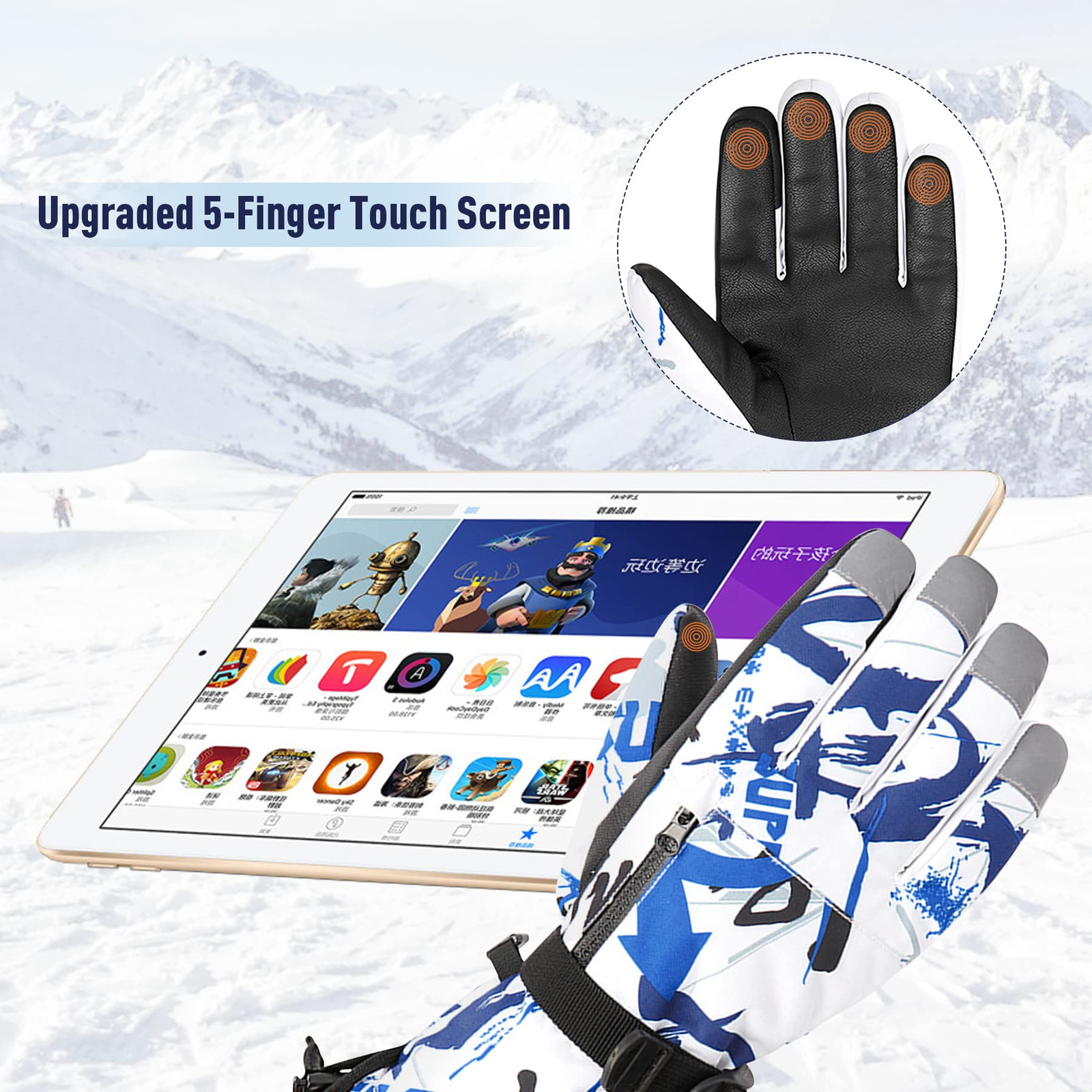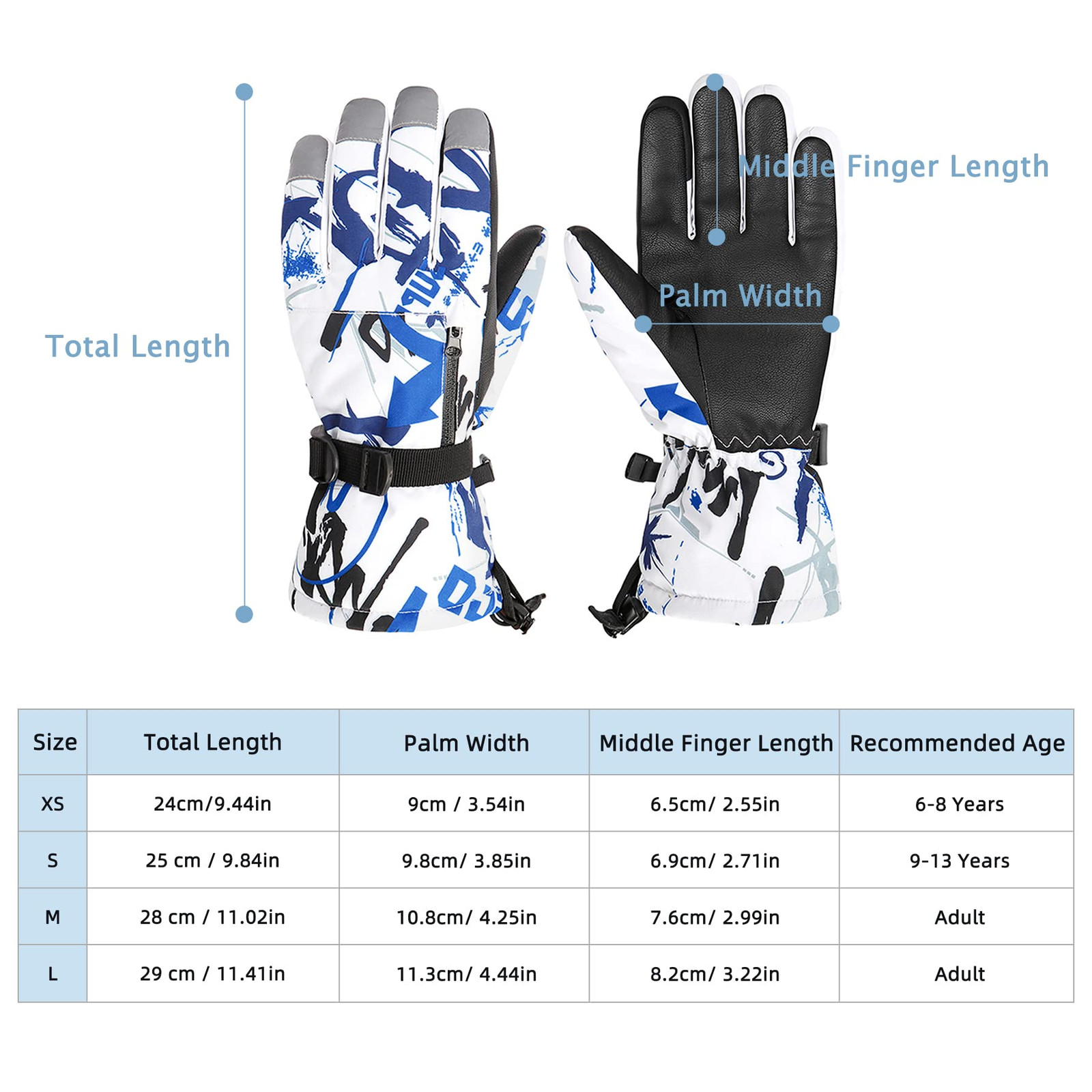 【Waterproof & windproof】Unlike the vast majority of ski gloves on the market that are just "waterproof", not only is the surface of the glove made of 100% waterproof and windproof fabric, but also the built-in waterproof membrane prevents water seepage, double guaranteeing high-density waterproof and windproof; in addition, the wrist is equipped with a windproof drawstring, which effectively prevents wind from entering through the wrist when you are playing outdoor sports. 【Upgraded 5-Finger Touch Screen & Fingertip Reflective Gloves】The ski gloves implement a full-finger touch screen design, so you don't need to take off the touch screen gloves when skiing or doing other winter sports. The reflective design of the fingertips allows you to be safer when doing outdoor sports such as skiing. The palm is made of PU material to increase friction and prevent slippage on the whole palm. 【Extremely insulated and comfortable ski gloves】If you are preparing for family winter outdoor activities, please choose these parent-child ski gloves with five-layer insulated design and super soft and warm lining to keep your hands warm even in the cold weather of -30 degrees Celsius, which can limit the cold and friction caused by wind chill and movement speed. 【Zippered Pocket & Anti-loss Buckle Design】The zippered pocket makes it easy to carry keys, cards, cash or other small items. The side buckle design prevents gloves from getting lost. 【Tips & Attention】The ski gloves are available in sizes XS, S, M and L. XS and S are suitable for children aged 6-8 and 9-13 years old, M for adult women and L for adult men.