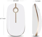 Fast Shipping On All Items 30 Days Money Guarantee Customer Support Excellent Service 100% Satisfaction Satisfaction Guaranteed Wireless Mouse, 2.4G Slim Portable Computer Mice with Nano Receiver for Notebook, PC, Laptop, Computer (White and Gold) Specification Item model number MS001 Color White and Gold Product Dimensions 4.5 x 2.5 x 0.1 inches Item Weight 2.4 ounces Connectivity Technology 2.4G Wireless Movement Detection Technology Optical Special Feature Wireless 2.5 inches x 4.5 inches x 0.1 inches. Weight: 2.4 oz Item Description LOW POWER CONSUMPTION: Intelligent sleep mode can better extend battery life. It will enter auto sleep mode if you don't use it for 5 minutes to save battery and need to click it, the mouse will enter working mode again STABLE CONNECTION: 2.4 GHz wireless provides stronger anti-interference ability, a faster transmission speed and a more reliable connection, working distances can up to 15 m, and high DPI can make it track more smoothly over most surfaces WIDE COMPATIBILITY:Well compatible with Windows7/8/10/XP, Vista, Mac OS X 10.4 etc. Fits for desktop, laptop, PC, Macbook and other devices ERGONOMIC & COMPACT DESIGN: USB-receiver stays in your PC USB port or stows conveniently inside the wireless mouse when not in use. The lightweight and simple features make the mouse perfect for the journey, office, home WHISPER & SENSITIVE CLICKING: Smooth frosted surface and quiet clicks can bring a better user experience and free your worry about bothering others and keep you stay focused while working Product Description Great Portable Mouse Slim Design Silent Click Plug and Play Wide Compatibility Package Include: 1 * Wireless Mouse 1 * USB Receiver 1 * User Manual 2.4G Stable Connection Stable wireless transmission distance up to 10m. Plug and play, no delay or drop out. (USB receiver is stored in the bottom of the mouse) Ergonomic Design Slim ergonomic design and smooth frosted surface for an incredible user experience Compact and Portable Its compact design makes it easy to bring the mouse with you wherever you need it Plug and Play A nano receiver plugs into your computer's USB port for a reliable wireless connection. No driver needed.Super easy to use Silent Design Mute design with the advanced sensor ensures silent clicks. You can use the mouse anywhere and won’t bother others About us We offer the best prices around on high quality products. Our E-store includes media such as books, movies, music and games while offering electronics, toys, sporting apparel, clothing, tools, general home, garden items and more. Shipping We are always working hard to ensure your package arrives as soon as possible. Please understand that some factors like weather, high postal traffic, and the performance of shipping companies are outside of our control. We offer free shipping to the lower 48 states and ship within 2-3 business days of payment, usually sooner. We do not accept P.O. Boxes. Please provide a physical address. For shipping outside of the continental USA, we only use eBay's Global Shipping Program.The item is shipped to KY and then sent to the rest of the world. International customers are responsible for all duties and taxes. Continue to check out to calculate costs for shipping the item to your country. Messages regarding eBay's Global Shipping Program MUST be directed at eBay EXCLUSIVELY. Returns We offer a 30-Day Return Policy on items in which you are not completely satisfied with. You have the option of a full-refund or an exchange of the item. No returns are available on items shipped outside of the USA Satisfaction We try over very best to make sure every customer is completely satisfied. If there's a problem, message us! We're happy to help. Payment Options Shop With Confidence