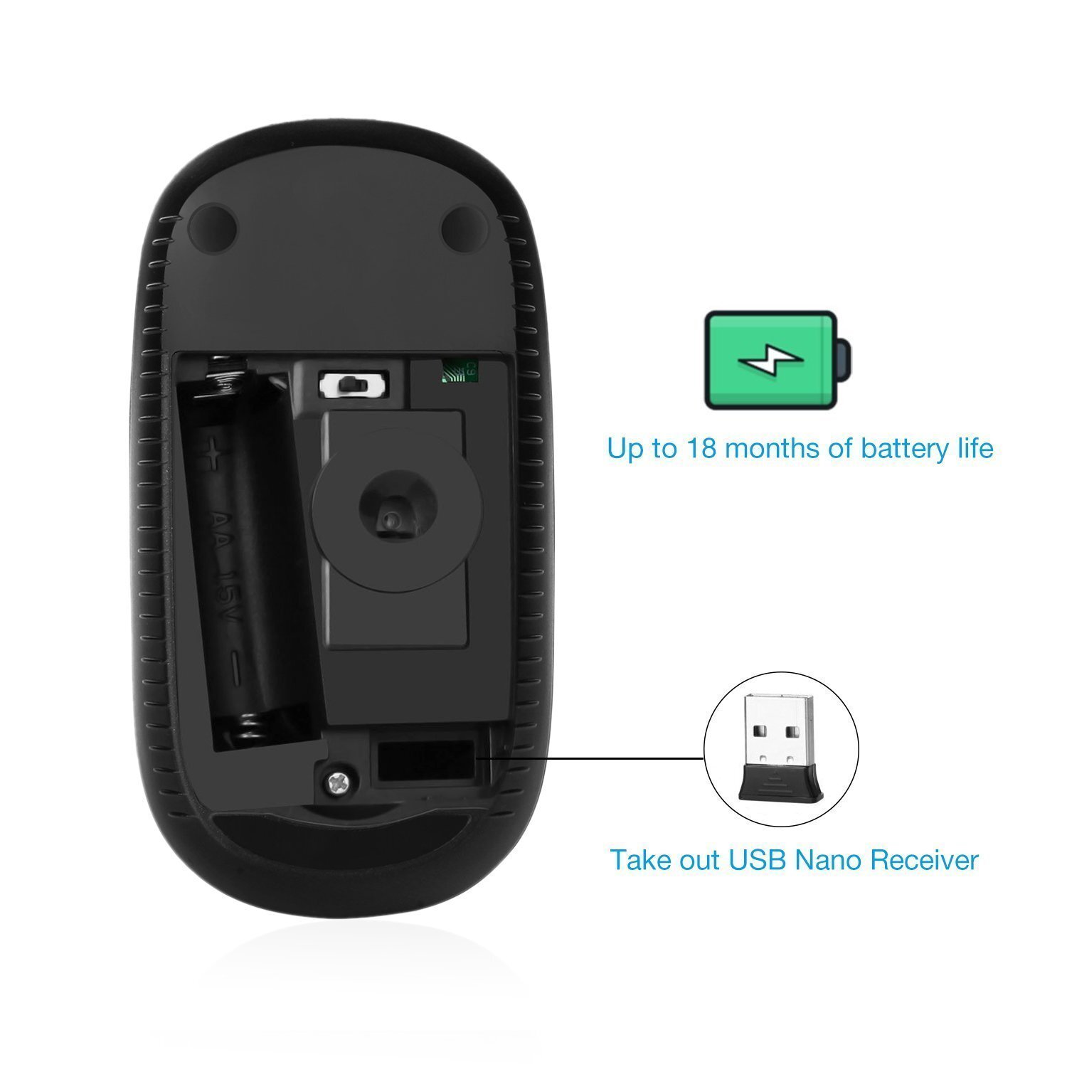 Wireless Mouse - 2.4G Slim Portable Computer Mouse with Nano Receiver, Less Noise Mobile Optical Mice for Notebook, PC, Laptop, Computer, Mac (Black and Gold) Enjoy freedom and efficiency when you use the Wireless Mouse. Compact design, easy to take to anywhere. Plug the nano transceiver into your computer's USB port for a reliable wireless connection without any hassle of additional wire and driver. High Movement resolution allows the mouse to track on nearly any surface. Quiet clicks make you concentrate more on your work, and don’t disturb people around. Product features: Wireless connectivity for reliable usage Advanced optical mouse with responsive tracking Noiseless click, soft touch High dpi movement resolution works on most surfaces. Wireless mouse reduces workspace clutter 3-button mouse for better functionality and fast scrolling capabilitySpecification: Dimensions: 1.4 x 2.6 x 4.7 inches (H x W x D) Battery: 1 x AA battery (not included) Handedness: Ambidextrous Interface(s): USB 2.0 Wireless: Yes Warranty: 1 year Brand Compatibility: Universal Model Compatibility: PC, Laptop, Windows devices System Requirements: Windows XP, Windows 7, Windows Vista, Windows 8, Windows 10, Windows 2000, Mac OS X 10.4 or later Number of Buttons: 3 Mouse Operation: Button(s) with scroll wheel Plug and Play Operation: YesPackage include: 1 x Wireless Mouse 1 x USB nano Receiver (stored in back of the mouse) 2.4GHz Stable Wireless Connection - A tiny wireless receiver (stored in back of the mouse) provides stronger anti-interference ability, faster transmission speed and more reliable connection up to 15m (49 feet), without any hassle of additional wire and driver. Just plug and play. Portable and Noiseless - Stow the USB receiver inside the wireless mouse when not in use. Take it to anywhere like home, office, coffee shop, etc. Responsive buttons provide soft click with less noise. Ergonomic Shape & Smooth Hand Feeling - Slim ergonomic design and smooth surface for an incredible user experience. Black and gold color perfect for office use, and can match any color device. Enduring Quality & Power Saving - High DPI Movement resolution allows the mouse to track on nearly any surface. Rated to 5 million comfortable clicks. Turn into sleep mode in 8 minutes of inactivity for energy saving, easily activated by clicking any button. 1 AA Battery (NOT Included) is needed for this mouse. Wide Compatibility - Work with Windows XP, Windows Vista, Windows 7, Mac OS X 10.4 etc. NOTE: This product is connected by USB receiver, and is NOT compatible with Macbook pro or other laptops which only come with type C port. Shipping from the USA All of our products are shipped from the USA, ensuring quick delivery to your destination. Payment We offer the following payment methods: PayPal, credit card, bank transfer, and eBay's secure payment system. Free Shipping & Free Returns Shipping within the USA is FREE. Additionally, any return is absolutely free for you. Risk-Free Purchase You have the option to return an item within 30 days without any justification. We cover the return shipping costs! Fast Shipping We ship immediately upon receipt of payment. Generally, the package is delivered within 2-3 days in the USA. If it takes longer, we will contact you. Quality and Costs Made in Europe, USA, China No customs fees or additional charges Total satisfaction guarantee Invoice with declared VAT available upon request in .pdf format Feedback Your feedback is very important to us. After you pay for your purchase, you will automatically receive positive feedback from us.