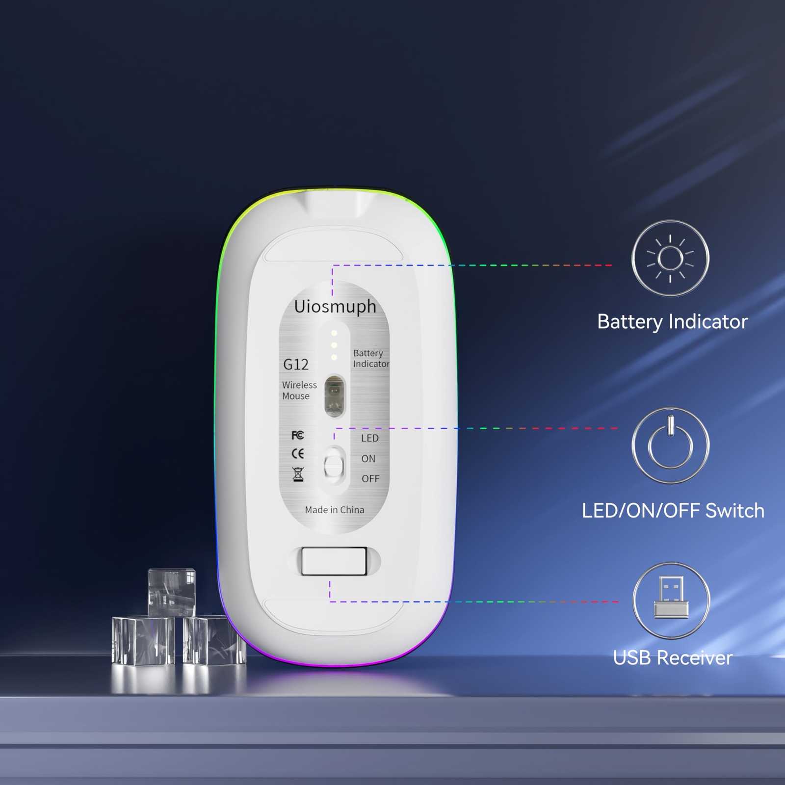 Rechargeable: Built-in rechargeable battery, no need change battery. Special soundless design for the right and left buttons, won’t disturb others. Colorful Light: 7 different color changes randomly while in use, offering soothing lighting, creating cool and fancy atmosphere for work and play. Energy Saving: The mouse will be in sleep mode in 8 mins of inactivity. And the LED light can be turned off by the bottom light switch. Slim & Portable: About 4.4 x 2.2 x 0.79 inches, Suitable for travelling carry and it can be easily put into your laptop bag and ultra-space saving. USB A and USB C Connection: This wireless mouse is packed with USB receiver (stored at the mouse bottom) and USB C adapter, works for computer with USB A or USB C port. For USB C connection, simply plug the USB receiver into the adapter, then plug adapter into your device. Widely Compatibility: This rechargeable mouse works for Windows 7/8/10/XP, Vista, Linux, Mac OS, Chrome OS etc. It's compatible with most of the computers with USB C port, like MacBook Pro after 2016, MacBook Air after 2018, Chromebook and more.