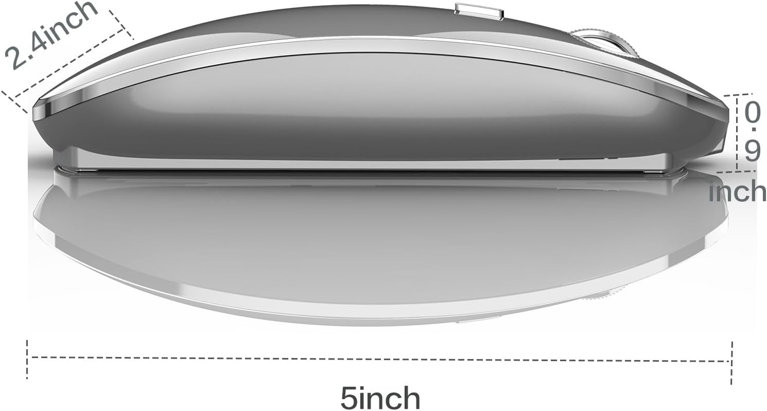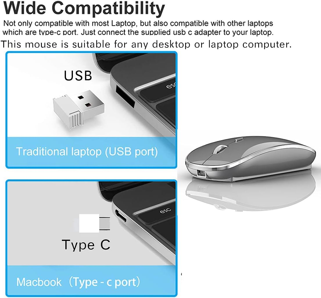 It is compatible with Mac iMac Macbook Pro Macbook Air 2012/2013/2014/2015/2016/2017/2018/2019/2020/2021/2022/2023/2024,XP, Vista, Win 7, 8, 10,11 Windows and is suitable for desktop computer,laptop, notebook, PC, and other devices. [Rechargeable Wireless Mouse] Built-in durable 450mAh lithium rechargeable battery can last up to 500 hours after fully charged, and standby time is super long with auto sleep and wake mode. Easily recharged through the included USB cable, no need to change the battery 【Wireless Mouse·1600 DPI】It can move freely within a range of up to 10 m through 2.4 GHz wireless transmission.You can use it easily without interference from cables, and enjoy more freedom than I thought.Adjustable with three levels precision (800/1200/1600 DPI), which can be tracked more precisely and correctly, the speed of the mouse can be controlled more freely and the operation can be more precise. 【Skin-Friendly for Comfort & Mute Click】Silent click Mouse with classic design with anti-fingerprint finish offers your hand maximum support and comfort. The sturdy anti-slip rubber scroll wheel ensures that your hand will not slip when scrolling.Quiet click sound when pressing buttons, which let you not worry about the mouse sound can disturbing others, especially at home or office, when other members having rest, you can focused on your work without worry. This wireless mouse plug and play, just two steps, is suitable for any desktop computer and laptop. The connection is 100% stable. It does not need to connect to the computer via Bluetooth, nor does it need to worry about Bluetooth disconnection and complex Bluetooth connection like a Bluetooth mouse This wireless mouse plug and play, just two steps, is suitable for any desktop computer and laptop. The connection is 100% stable. It does not need to connect to the computer via Bluetooth, nor does it need to worry about Bluetooth disconnection and complex Bluetooth connection like a Bluetooth mouse Packing list: instruction *1, Rechargeable Wireless Mouse *1, USB wireless receiver *1 (taken out from the bottom of the mouse), type C receiver *1 (taken out from the bottom of the mouse), USB charging cable *1, packing carton *1. How do I use this wireless mouse on my laptop? 1: Remove the USB receiver or Type C receiver at the bottom of the mouse (remove the receiver suitable for your computer/laptop port) and plug the receiver into the port of your computer /laptop 2: Turn on the mouse switch, move the mouse or press the left and right mouse buttons, and the mouse will start working on your computer desktop,Plug and play, only need 2 steps to use. How do I charge this mouse? When the pointer of your mouse does not move or cannot be used, or suddenly disconnects continuously in use, you need to charge it for about 3 hours. Please use the USB port of your computer to charge it, or use an adapter with an output of no more than 5v to charge it This is a rechargeable mouse. It doesn't require you to buy any other batteries. It already has a built-in lithium battery. It can be charged like a mobile phone. There is a USB charging line in the box