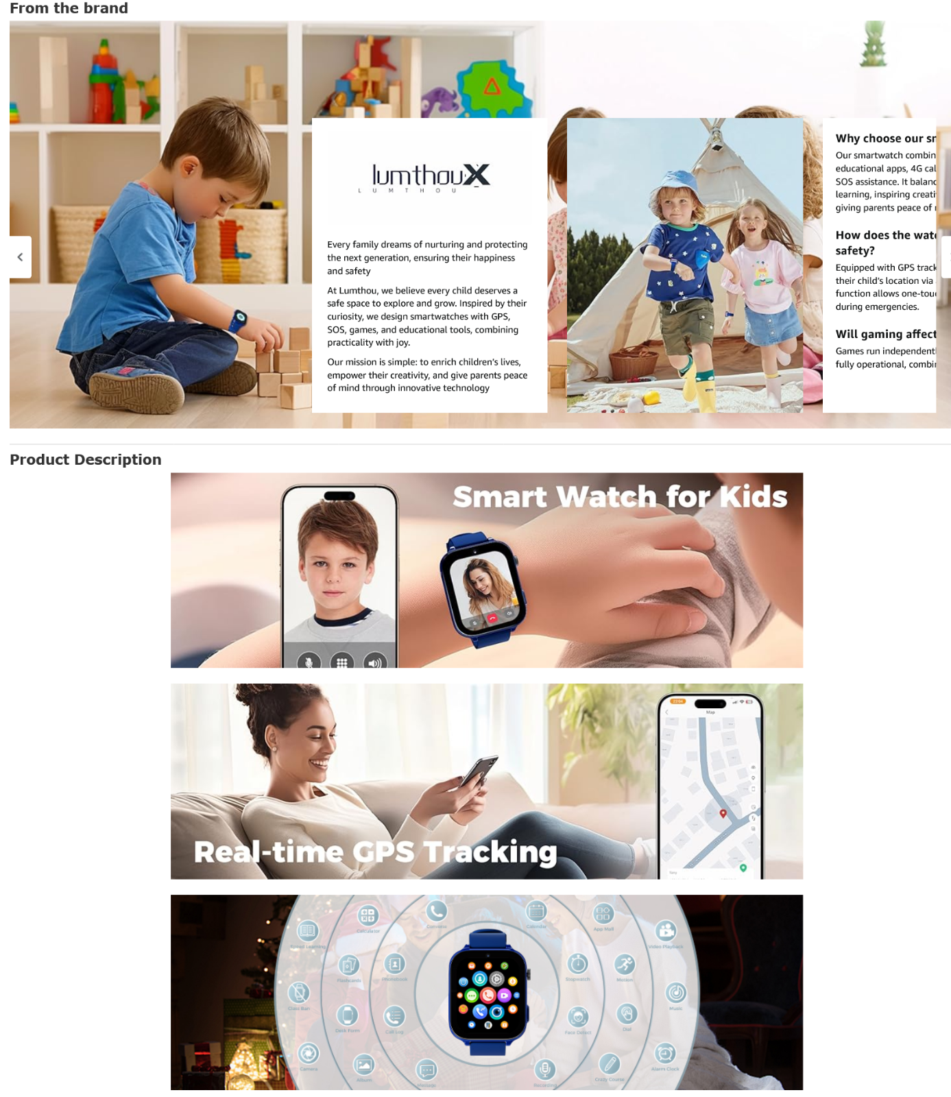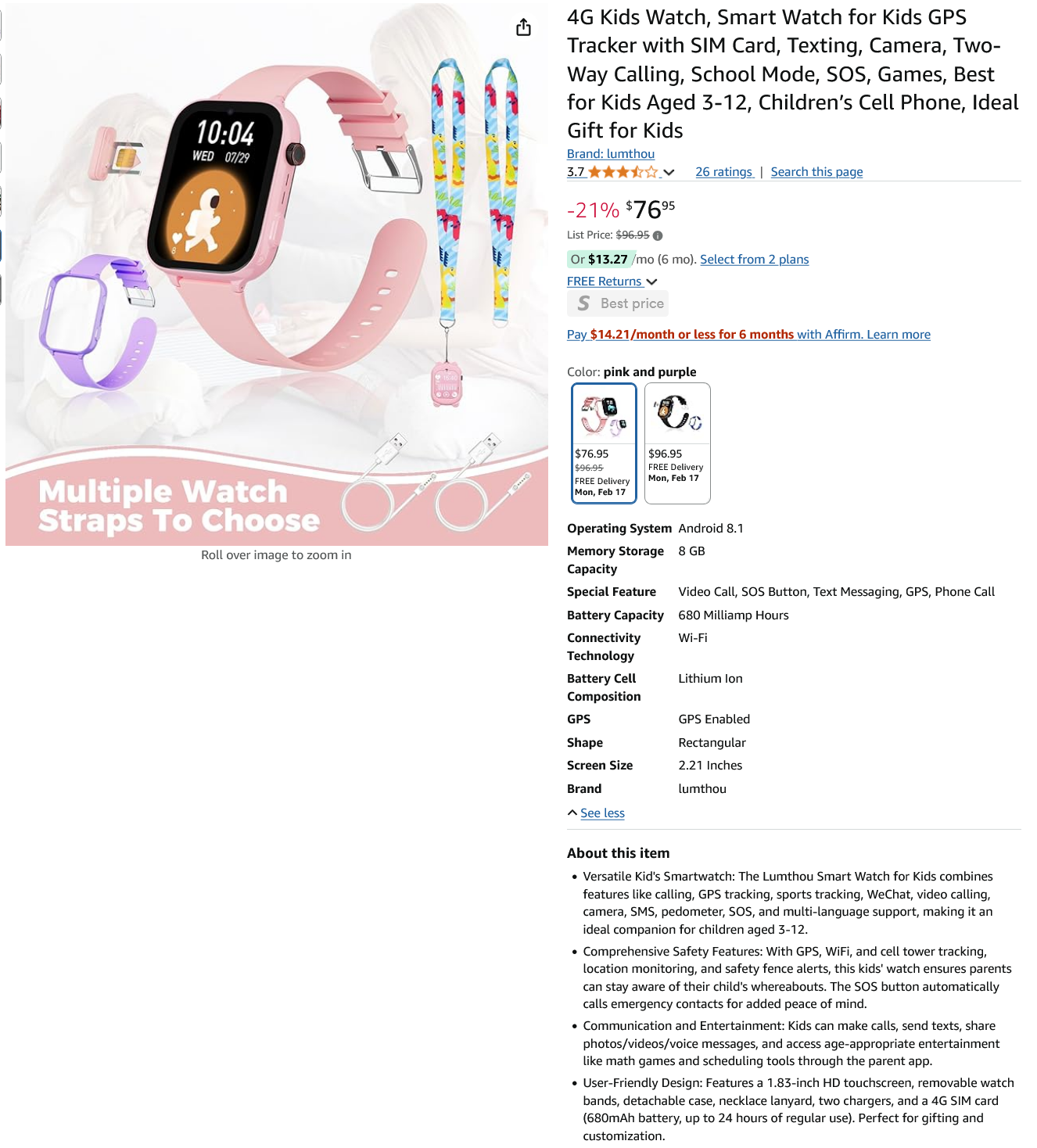 From the Brand: Versatile Kid's Smartwatch: The Lumthou Smart Watch for Kids combines features like calling, GPS tracking, sports tracking, WeChat, video calling, camera, SMS, pedometer, SOS, and multi-language support, making it an ideal companion for children aged 3-12. Comprehensive Safety Features: With GPS, WiFi, and cell tower tracking, location monitoring, and safety fence alerts, this kids' watch ensures parents can stay aware of their child's whereabouts. The SOS button automatically calls emergency contacts for added peace of mind. Communication and Entertainment: Kids can make calls, send texts, share photos/videos/voice messages, and access age-appropriate entertainment like math games and scheduling tools through the parent app. User-Friendly Design: Features a 1.83-inch HD touchscreen, removable watch bands, detachable case, necklace lanyard, two chargers, and a 4G SIM card (680mAh battery, up to 24 hours of regular use). Perfect for gifting and customization.