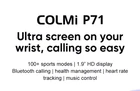 COLMi P71 - Voice Calling Smartwatch Value King Health Features: Wrist-based Heart Rate (automatic measurement), Blood oxygen, Blood Pressure, Sleep tracker, Drink water reminder, Reminder to move, Women's Physiological cycle, Zen mode, Support health APP. Voice Calling Features: Voice Calling, Dial Pad, Recent Call, Contact, Call Rejection, Voice Assistant. Life Features: Smart Notifications(Call, Text, Gmail and Smartphone App Notifications), Alarm clock, Game, Flashlight, Timer, Stopwatch, Weather, Controls Smartphone Music and Camera, Find My Phone and Watch, Calculator, Set the screen off time, Do not disturb mode. Sports Features: Activity Record( Steps, calories, distance), Sport Goal, 100+ Exercise Modes, Sports Data Report, IP68 waterproof. Watch Faces APP Sync: 230+ watch faces System Default: 7 Customize Watch Faces: Support, you can set the picture you like as the watch face. COLMI P71 Spec. Main chipset: Realtek RTL8763E Display size: 1.9 ''large TFT color display. Display Resolution: 240*285 pixels Battery Capacity: 230 mAh Li-pol battery. Battery Life: Standby mode: Up to 20 days Typical usage modes: Up to 10 days Heavy usage modes: Up to 5 days Coutinuous Voice Calling: Up to 280 mins Charging Time: About 1.5 hours Waterproof level: IP68 Waterproof APP: "pubu Wear" Suitable for mobile phones with Android 5.0 or higher, or iOS 9.0 or higher. Language English, Portuguese, Arabic, Russian, Ukrainian, German, Japanese, Spanish, Italian, French, Greek, Dutch, Turkish, Polish, Romanian, Thai, Vietnamese, Indonesian, Hebrew, Bahasa Malaysia, Simplified Chinese. Sport modes: Walking, Running, Hiking, Cycling, Basketball, Badminton, Soccer, Elliptical, Yoga, Table Tennis, Rope skipping, Tennis, Baseball, Rugby, Hula Hoop, Golf, Long Jump, Sit ups Sports Push: Outdoor Cycle, Outdoor Run, Indoor Run, Outdoor Walk, Mountaineering, Basketball ,Badminton, Football, Elliptical trainer, Yoga, Table Tennis, Jump Rope, Rowing Machine, Free Training, Tennis, Baseball, Rugby, Cricket, Strength Training, Indoor Walk, Indoor Cycle, Dance, Hula Hoop, Golf, Long jump, Sit up, Volleyball, Parkour, Hiking, Hockey, HIIT, Softball, Trail running, Skiing, Air Walker, Cool down, Cross Training, Pilates, Cross fit, Functional Training, Physical Training, Mixed Cardio, Latin Dance, Street Dance, Kickboxing, Barre, Australian Football, Bowling, Racquetball, Curling, Snowboarding, Fishing, Disc Sports, Downhill Skiing, Core Training, Skating, Fitness Gaming, Aerobics, Group Training, Kendo, Fencing, Stairs, American Football, Rolling, Pickle ball, Boxing, Taekwondo, Karate, Flexibility, Handball, Hand Cycling, Mind & Body, Wrestling, Step Training, Tai Chi, Gymnastics, Athletics, Martial Arts, Play, Snow Sports, Lacrosse, Single Bar, Parallel Bars, Roller Skating, Darts, Archery, Horse Riding, Shuttlecock, Ice Hockey, Waist training, VO2max Test, Judo, Trampoline, Skateboarding, Hoverboard, Blading, Treadmill, Pull-up, Push-up, Planking, Rock Climbing, High jump, Bungee Jumping, Folk Dance. Q&A Q: What's the name of the app? A: The name of the app is Pubu Wear. You can search and download it in Google Play or App Store. Q: What is the size of the bracelet? A: The width of the strap is 22mm. Q: What's in the box? A: P71 Smartwatch, charger cable, paper manual, protective film. Q: Which adaptor should I use to charge my watch? A: Please use a low power adapter or you can plug in the charging cable into a laptop or PC USB port. Do not use a fast charging adapter as it may damage the watch in the long run Q: This watch is waterproof? A: Yes, it has an IP68 rating. It can go underwater up to a depth of 1.5m for up to 30 minutes. However, avoid saunas, hot water and ocean water. Q: Can it be used while swimming? A: You can wear the smartwatch in the swimming pool but cannot use it while swimming. Q: Whether the watch is original? A: Yes, it is supplied by the COLMI brand.