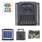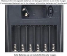 Solar AA & AAA Rechargeable Batteries Charger for NiMH NiCD & 9V Battery with 2Watt Solar Panel Portable Backup for Ni-MH Ni-CD Household BatteryNo Battery Included [7-Bay Battery Charger]--The solar charger can trickle charge 6pcs aa/aaa rechargeable batteries and 1pcs 9volt battery together.Applicable batteries AA size, AAA size, and 9 Vot battery. This range of household batteries are used in most electronic devices, such as Disc player,Remote control, Radios, Shavers,Toys, torches,outdoor solar Landscape string lights,solar walkway light,solar power motion sensor security lights. [2Watt Solar Panel and Green Power]--It is a very good backup household battery charger builtin solar panel is made of crystalline solar cell. And the output power is is also good for emergency and outdoor amount of electricity produced varies according to the strength of sunlight. When under full sun (1000W/㎡), the solar cell produces Min. 600mA per hour. For 9V battery charging, the solar panel produces Min. 20mA per hour. It would be a little bit slow for 9V Battery. [Charging LED Indicators]--Built-in with LED Red indicator goes on when the solar panel is charging the battery. The Green light indicator goes on when the battery is fully there is no battery in the solar battery charger while it is placed under sunlight. The “Battery Full” LED will go on. [Retractable Handle]--This solar battery charger has a retractable handle, which can be pull out for convenient carrying. The handle can also be folded as a support to tilt the solar battery charger, which help to get more power from the sunlight. For optimal power, ensure the solar panel (solar cell up) is directly facing the sun. [Stronger and Durable]--Covered with ultra clear PV glass which is more efficient and also with Durable ABS plastic housing which is stronger. With BUILT-IN DIODE for prevents reverse charging from batteries. Feature: Under the sunlight, the built in solar panel can transform sunlight into DC electricity, then give powerful charge to the batteries. The amount of electricity produced varies according to the strength of sunlight. When under full sun (1000W/㎡), the solar cell produces Min. 600mA per hour. For 9V battery charging, the solar cell produces Min. 20mA per hour. Note: (1).When the solar battery charger is not in use, please slide the ON/OFF switch to OFF position, else product will drain power in the battery. (2).Please make sure the battery(s) are placed in proper polarity. “+” indicates positive, and “-” indicate negative. (3).This product is not fully waterproof, it is only splash proof. Please do not left it outside during rainfall or submerge in water. (4).Keep the solar cell clean with a soft cloth for producing more to the AC battery charger, the solar charger would be a little bit slow. (6).It is better to charge at least 2pcs battery together.