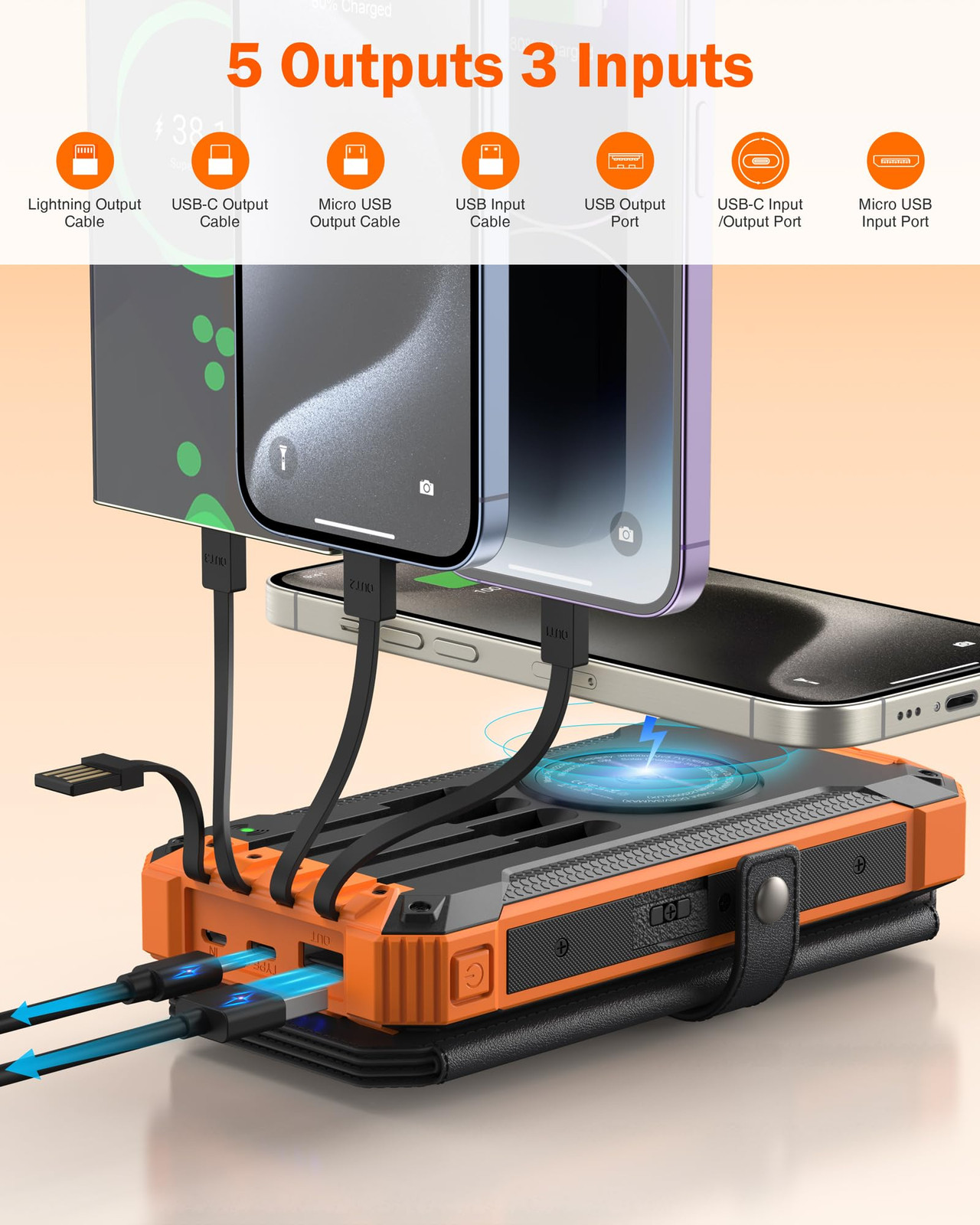 [High Capacity & Five Solar Panels] : The power bank boasts a massive 36800mAh battery, utilizing high-quality batteries for safety, durability, and long-lasting performance. With five solar panels, charging speeds are faster than single-panel alternatives. Don't settle for slow solar charging – upgrade to our solar power bank for an enhanced and efficient charging experience [Built-in Cables for Multi-Device Compatibility] : Say goodbye to the hassle of carrying multiple charging cables. The solar charger comes equipped with four built-in output cables, catering to a variety of charging needs. Featuring multiple ports, it can power up to five devices simultaneously, offering unparalleled convenience for your mobile lifestyle [Wireless Charging Technology] : Experience effortless phone charging on-the-go with the wireless phone charging feature of our solar charger power bank. Enjoy quick and cable-free charging, ensuring you stay powered up on any journey without the limitations of wired connections [Brighten Your Journey] : The solar battery charger comes with two bright LED flashlights built-in, providing you with convenient lighting. It provides strong illumination in the night or dark environment, allowing you to maintain a clear view in power outages, emergencies, outdoor exploration, and unexpected situations, providing you with extra safety and convenience when you need it most [Durable Protective Design] : Designed to withstand diverse elements, our solar panel charger features silicone covers for its charging ports, offering drop, dust, and water resistance. Additionally, the included carabiner clip allows you to attach it to your gear or backpack for hands-free charging, ensuring convenient portability on all your outdoorursions [Thanks for choosing us] : Every product is certified safe and provided with a lifetime warranty. We also provide professional pre-sales and after-sales service for you. Any questions, please feel free to contact us. We promise you a satisfactory solution within 24 hours