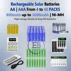 New Solar Rechargeable Batteries AA OR AAA - choose from 4 to 48 batteries with or without charger (based on your choice), we also sell the chargers separately. All purpose general use for lights, toys, video games controllers, remote control, home general use, outdoor use, garden lights, LED, Candles, Electronics, and more. Choose between 600mAh up to 3000mAh based on your device and what it supports! (The mAh capacity rating refers to the storage capacity available for a particular battery. A battery with a capacity rating of 3000 mAh could deliver a current of 3000mA for several hours, higher mAh ratings for the same battery type will generally mean longer run times.) Different Packs of Solar for garden lights, toys, electronic devices and many other (the color of the batteries sometimes may vary) High quality rechargeable batteries, long lasting product Ideal for solar-powered units. No memory effect, Long lasting batteries Product Material: Ni-Mh Batteries colors may vary. Expected Life time: more than 500 Cycles ----------------