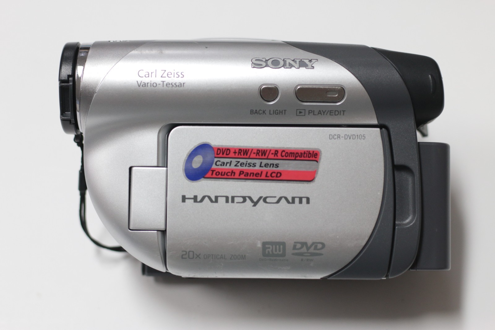 The Sony Handycam Camcorder DCR-DVD105 is a handheld unit with a sleek silver design, ideal for capturing memories in standard definition. It features a 20x optical zoom and 800x digital zoom for clear and detailed footage. The camcorder also includes an LCD screen for easy viewing, and utilizes DVD-R media for storage. This model is part of the Sony Handycam series, known for its quality and reliability in capturing moments with ease. Made in Japan, this camcorder comes with its original box, manual, charger, and additional DVD-R for convenience.