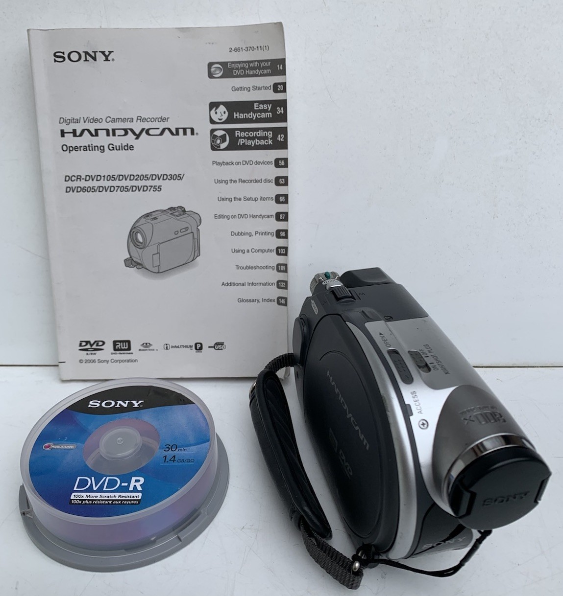 Many scratches on camera body, comes with battery and manual and some disks as pictured, works as it should This Sony Handycam DCR-DVD105 camcorder is a great addition to your electronics collection. With its silver color and handheld design, it's easy to use and carry around. It features a 20x optical zoom and 800x digital zoom, allowing you to get a clear and detailed view of your surroundings. The camcorder also has night vision capabilities, so you can record in low light conditions. The Sony Handycam comes with a 2.0 inch LCD screen and USB connectivity, making it easy to view your footage and transfer it to your computer. It uses a DVD-R media format for storage, which is removable and easy to transfer to another device. This camcorder has been tested and comes with extra accessories, making it a great bundle for anyone looking to record their adventures.