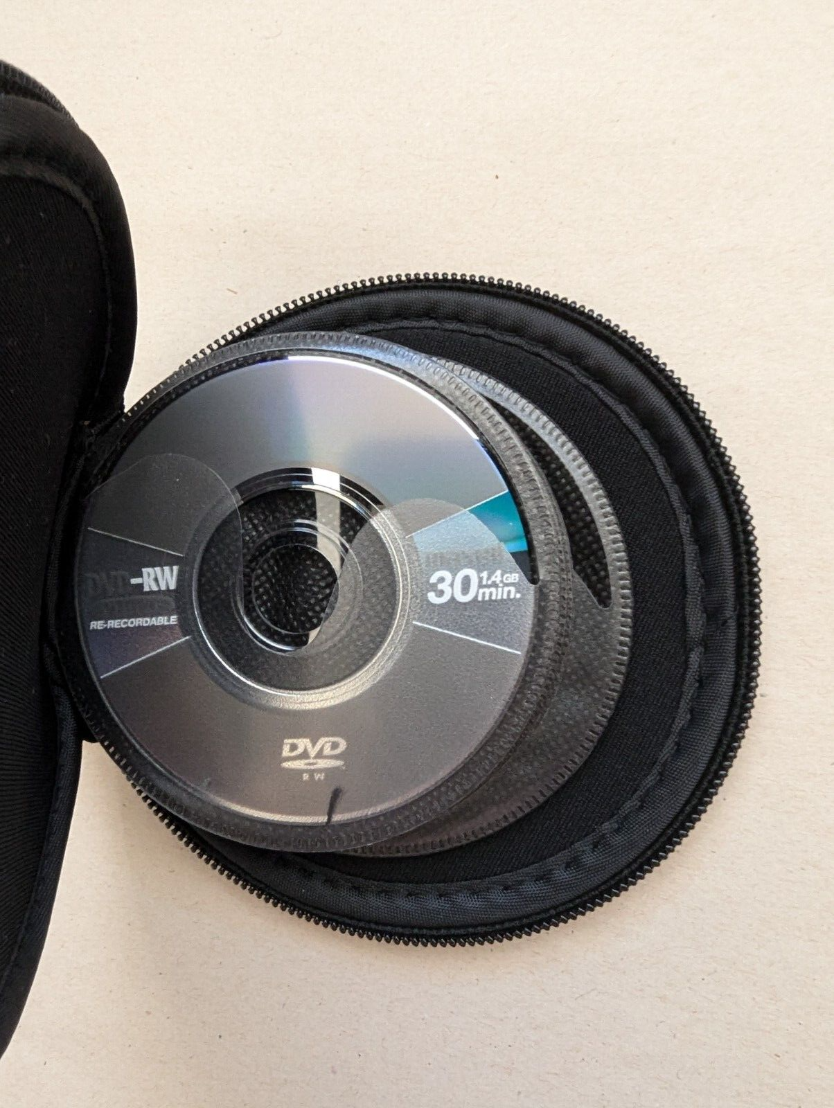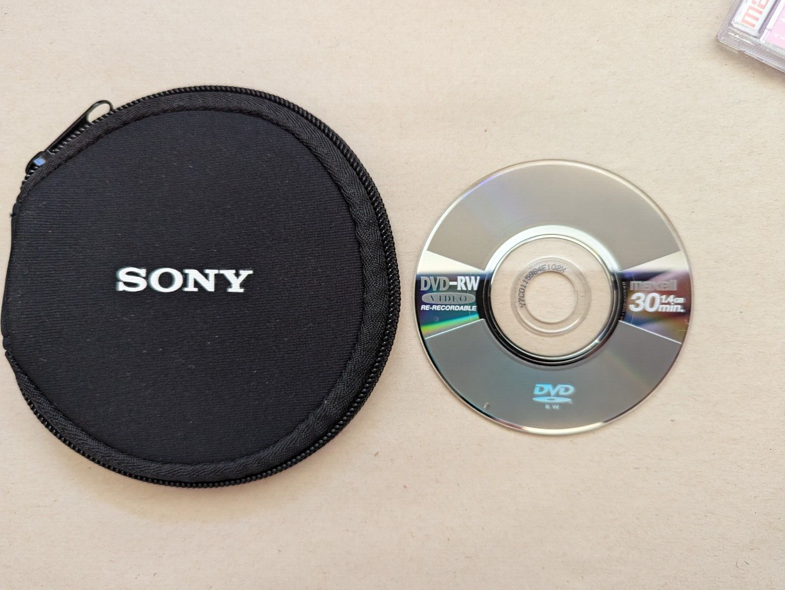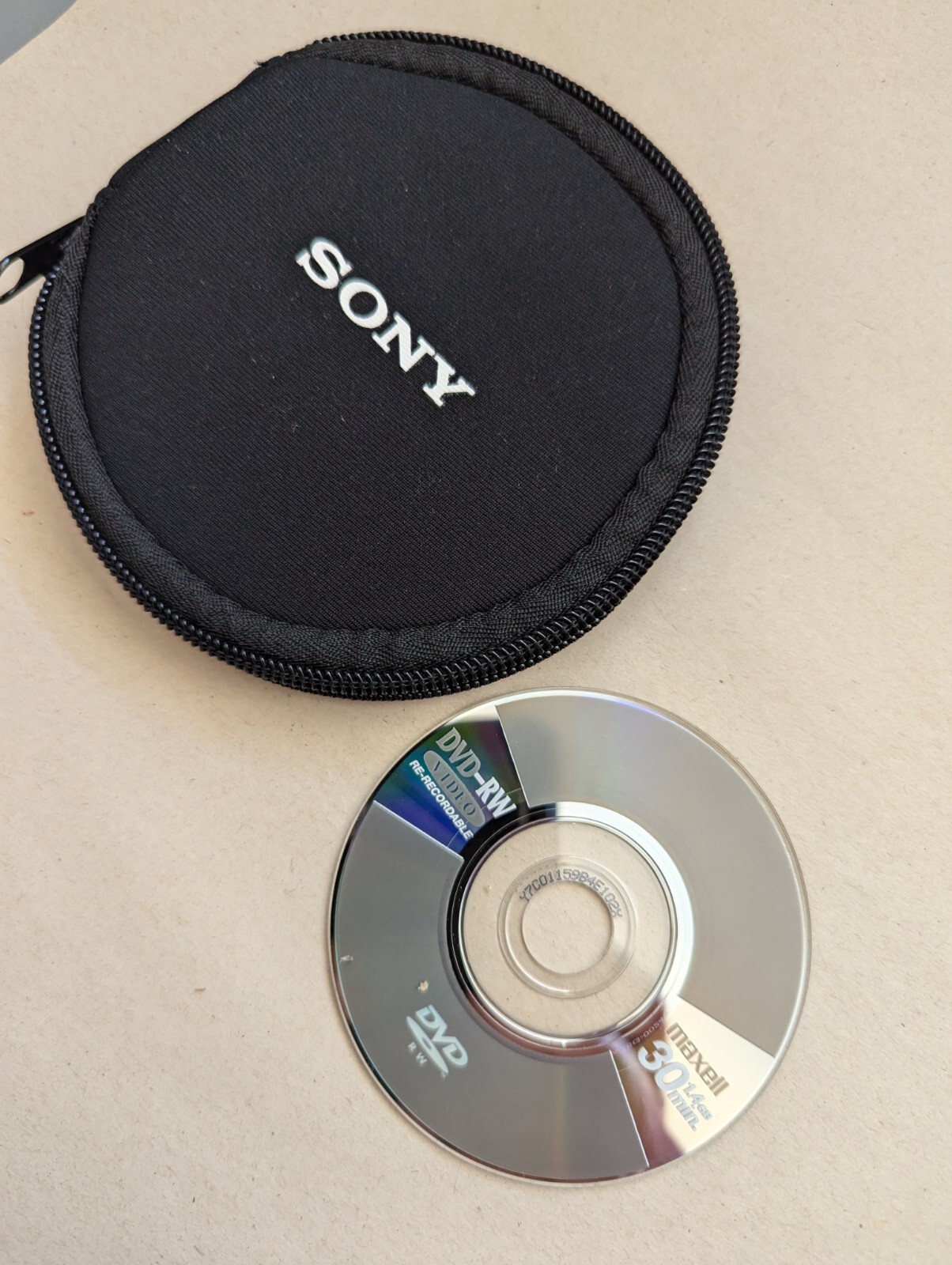 Sony Portable soft carry Storage case holds 14 DVD-R Disc Handycam or Camcorder, Disc shown in picture is not included with soft case. Please read below. The condition is new, never used no packaging or tags included +++This listing is for the soft case only no Discs included only used to show how the discs fit, these are not full-size DVD OR CD CASES USED FOR THE CAMCORDER DVD-R HANDYCAM OR CAMCORDER SIZED DISCS that are much smaller. Please see pictures for part of the description.