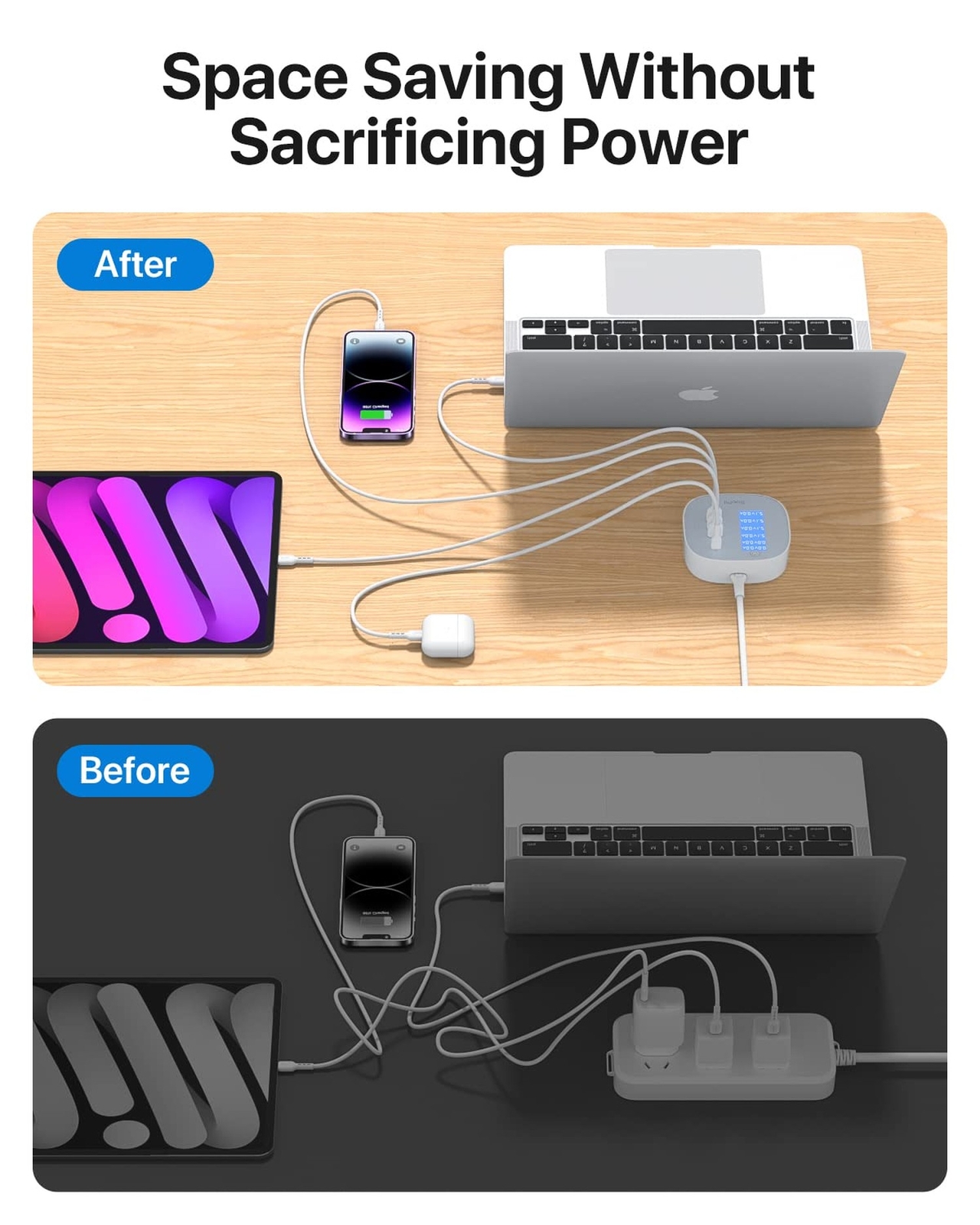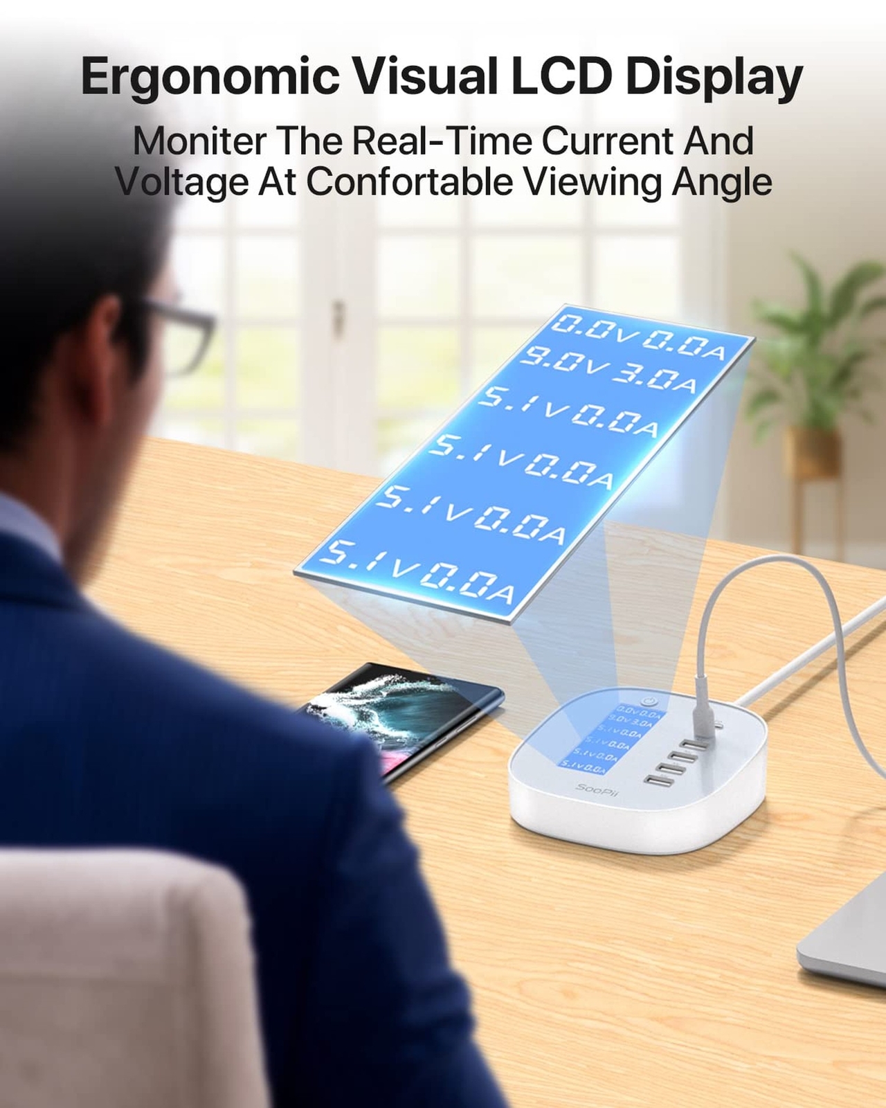 SooPii USB-C Charger 65W, 6 Port USB Charging Station with Real-time LCD Display in Charging, with Dual USB-C Ports PD/PPS Fast Charging Compatible for MacBook,USB C Laptops,Tablet and Phones. Product Details Style: 65W USB Charger Brand: SOOPII MPN: DC20 EAN: 6971008014617 UPC: Does not apply Brand: SOOPII Connectivity Technology: Wired Connector Type: USB-A+USB-C Compatible Devices: Smartphones, Headphones, Tablets, Monitors, Smartwatches Compatible Phone Models: LPhone 15/15 Pro/15 Plus/15 Pro Max/lPhone 13 / 13 Mini / 13 Pro / 13 Pro Max / lPhone 12 / 12 mini / 12 Pro / 12 Pro Max / lPhone SE 2020 / 11 Pro Max / 11 Pro / XR / Xs Max / Xs / X / 8 Plus / 8 / Samsung Note 10+ / 9 / S21 / S20 Ultra / S20+ / S20 / S10+ / S10e / S10 / S9+ / S9 / Samsung Z Flip / Google Pixel 4XL / 4 / 3XL / 3 / LG G7/V40 / Sony XZ3/Xperia 1 / iPad 10.2-inch / iPad mini 8.3-inch / iPad Pro 12.9” 2020 / iPad Pro 11” 2020 / iPad Pro 12.9” 2018 / iPad Pro 11” 2018 / iPad mini 5 / MacBook Pro 13’’ 2019 / MacBook Pro 16 / MacBook Air 2020 / MacBook Air 2018 / Microsoft Surface Pro 6 / HP Spectre x2 12" / HP Spectre x360 2019 / HP Spectre Folio / HP PavGaming / Samsung Notebook 9 / Google Pixelbook / Dell XPS 13 9360 / Dell XPS 13 9380 / ThinkPad X1 / ThinkPad X390 / ThinkPad E490LPhone 15/15 Pro/15 Plus/15 Pro Max/lPhone 13 / 13 Mini / 13 Pro / 13 Pro Max / iPhone 12 / 12 mini / 12 Pro / 12 Pro Max / lPhone SE 2020 / 11 Pro Max / 11 Pro / XR / Xs Max / Xs / X / 8 Plus / 8 / Samsung Note 10+ / 9 / S21 / S20 Ultra / S20+ / S20 / S10+ / S10e / S10 / S9+ / S9 / Samsung Z Flip / Google Pixel 4XL / 4 / 3XL / 3 / LG G7/V40 / Sony XZ3/Xperia 1 / iPad 10.2-inch / iPad mini 8.3-inch / iPad Pro 12.9” 2020 / iPad Pro 11” 2020 / iPad Pro 12.9” 2018 / iPad Pro 11” 2018 / iPad mini 5 / MacBook Pro 13’’ 2019 / MacBook Pro 16 / MacBook Air 2020 / MacBook Air 2018 / Microsoft Surface Pro 6 / HP Spectre x2 12" / HP Spectre x360 2019 / HP Spectre Folio / HP PavGaming / Samsung Notebook 9 / Google Pixelbook / Dell XPS 13 9360 / Dell XPS 13 9380 / ThinkPad X1 / ThinkPad X390 / ThinkPad E490 See more Included Components: 1*SooPii 65W Charging Station, 1*Power cord,1*User manual Cable Length: 3 Yards Special Feature: Ergonomic Visual LCD Display,High-Speed 45W USB-C Charging,2 USB-C Port,4 USB-A Port Color: White Input Voltage: 120 Volts Product Dimensions : 4.2 x 4.22 x 2.07 inches; 9.74 ounces Item model number : DC20 Date First Available : September 1, 2022 Manufacturer : SOOPII Country of Origin : China Best Sellers Rank: #125,444 in Cell Phones & Accessories (See Top 100 in Cell Phones & Accessories) #1,443 in Cell Phone Charging Stations #1,443 in Cell Phone Charging Stations Customer Reviews: 4.3 4.3 out of 5 stars 297 ratings Charge 6 Devices SimultaneouslyWith two USB-C ports and four USB-A ports offering total 65W of power, you can charge your phone, tablet, laptop, and more all at the same time. Lightweight and Compact Design,always Save Space on Your Desk, ideal charging companion for your home, office and business travelling. High-Speed USB-C ChargingWith PD/PPS(Programmable Power Supply) protocol,charge notebooks in high-speed at 45W max output from single USB-C port.When using both USB-C ports, total output will be 40W (20W + 20W). Ergonomic Visual LCD DisplayHigh-Resolution LCD Display Screen to show real-time Voltage and Current from each port in Charging. With its Slope Ergonomic Design, you can always monitor the charging status at your Comfortable Viewing Angle. And you can turn on/off the display with the round switch on the top. Multi Safety and ProtectionSooPii USB wall charger with UL certified.Built-in overcharge,over-current,overheat,overload and short circuit protection, ensure all-round protection your devices and greatly extend the battery life for your devices. What You Get In Box 1*SooPii 65W Charging Station, 1*Power cord,User manual, our worry-free 24-month warranty, and friendly Customer Service.