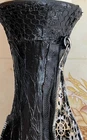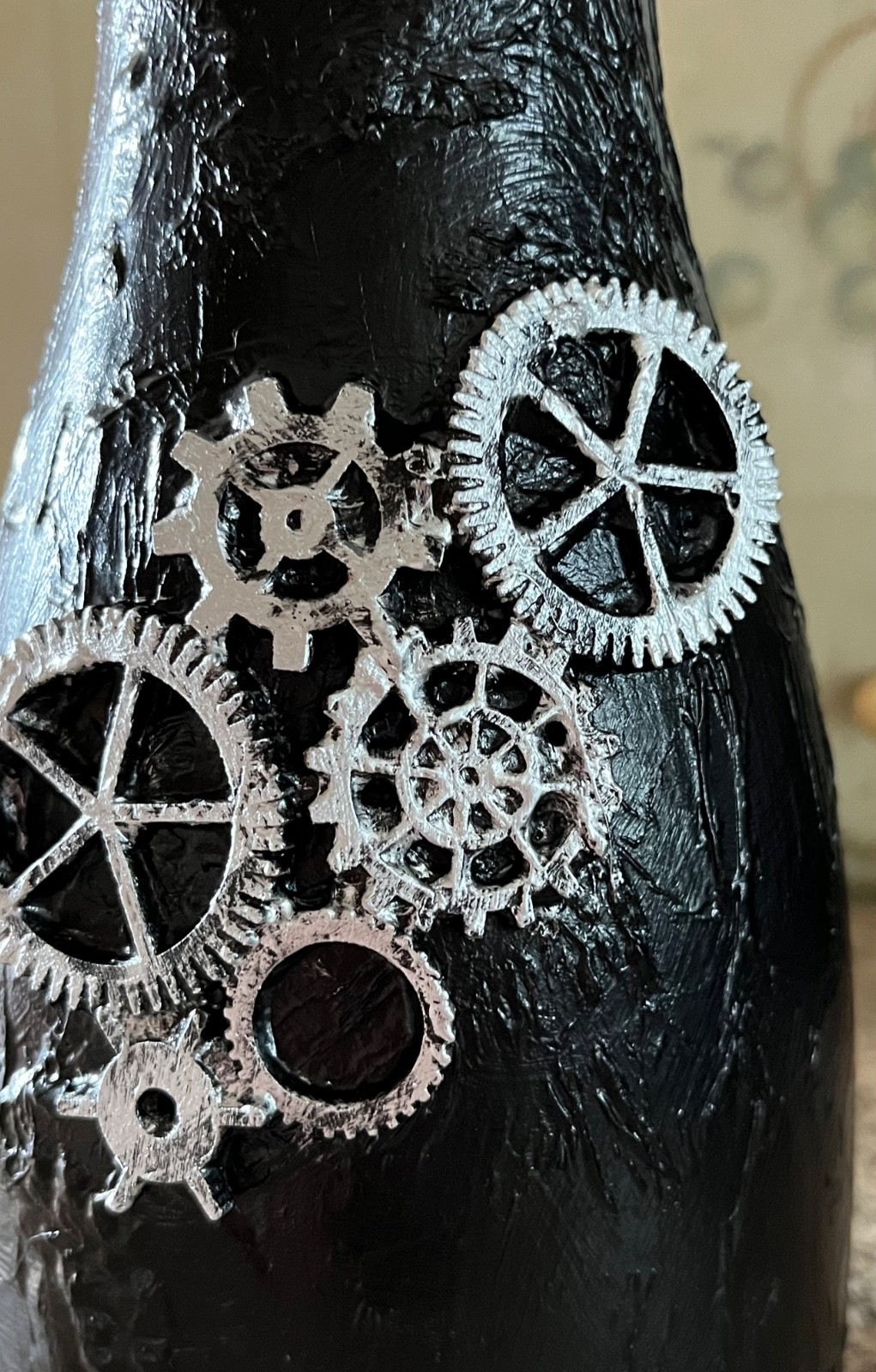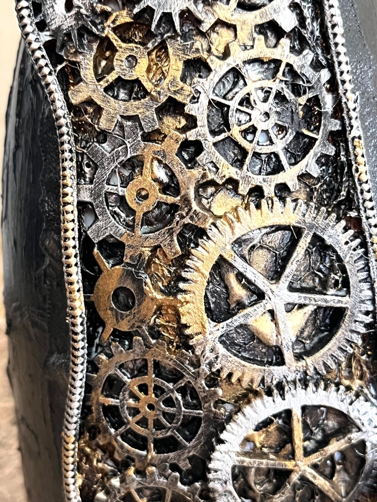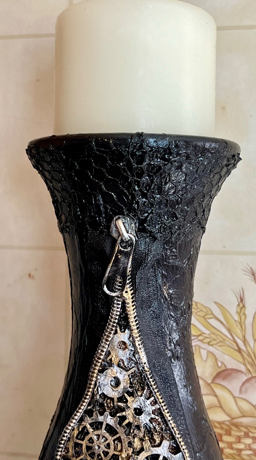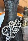 Enhance your Halloween table decor with this steampunk glass candle holder or vase, featuring a Gothic design that perfectly captures the spooky atmosphere of the season. The multi-coloured glass adds a touch of whimsy to your dining space, while the Halloween theme ties in seamlessly with your celebrations. Perfect for creating a warm and inviting ambiance at your Halloween gathering. Size approx 16 inch x 3 inch