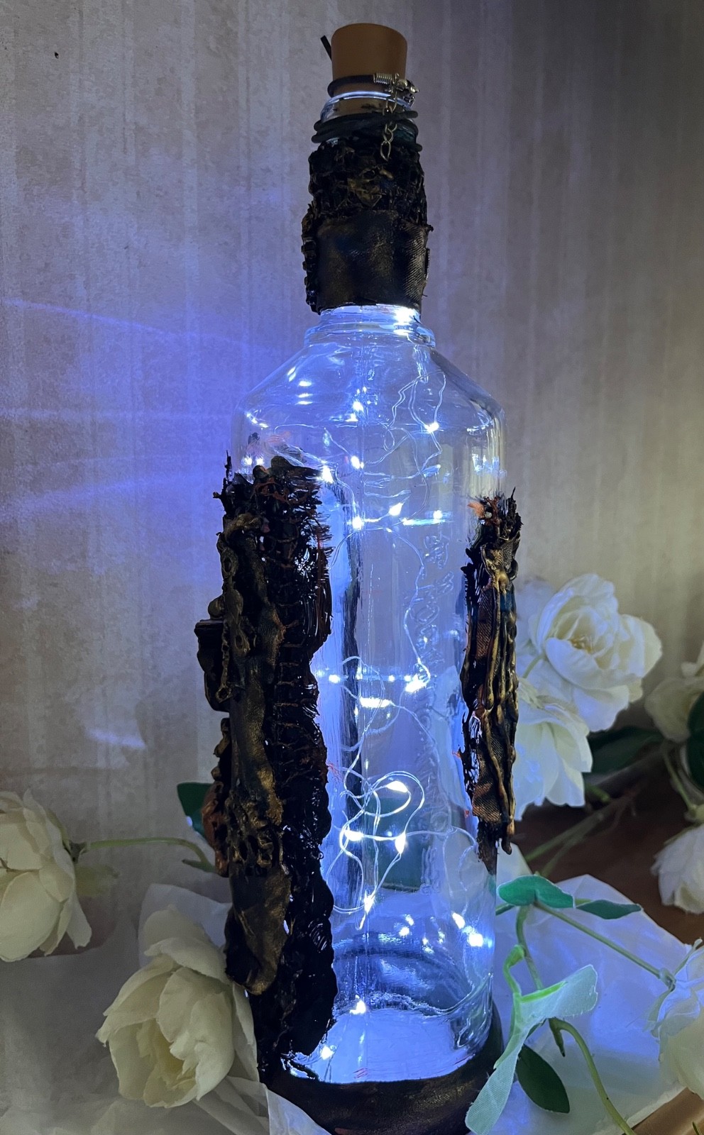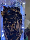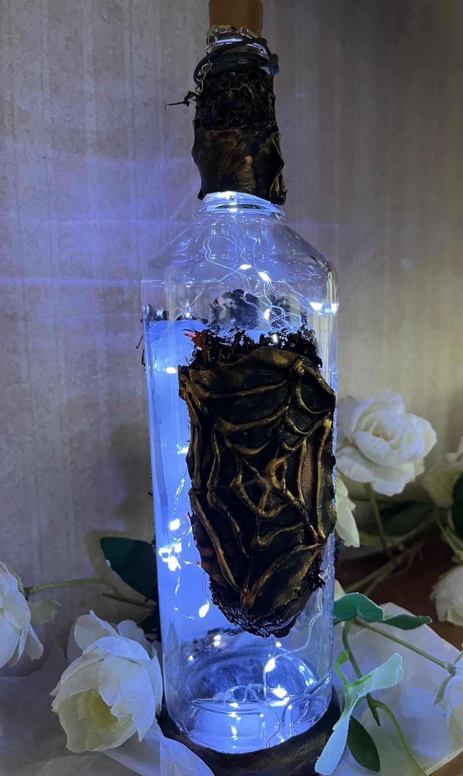Add a touch of gothic charm to your Halloween table decorations with this eerie steampunk pumpkin glass bottle. The intricate design and dark character make it a perfect addition to your Halloween celebrations. Made from glass with a multi-coloured finish, this table decoration exudes a mystical vibe that will delight guests and enhance the spooky atmosphere of your home. Let this unique piece be the centrepiece of your Halloween table setting for a touch of whimsical horror. Handmade glass bottle 12” by 3.5” Steampunk home decor adds a great table decoration for any Halloween party comes with LED lights Or Add a slim stick candle or rose flower of your choice to complete the look We can make bespoke bottles if you have something in mind , please add your theme to message option We will consider offers and or bulk buy discounts Please have a look at our shop and enjoy Kind regards Jo