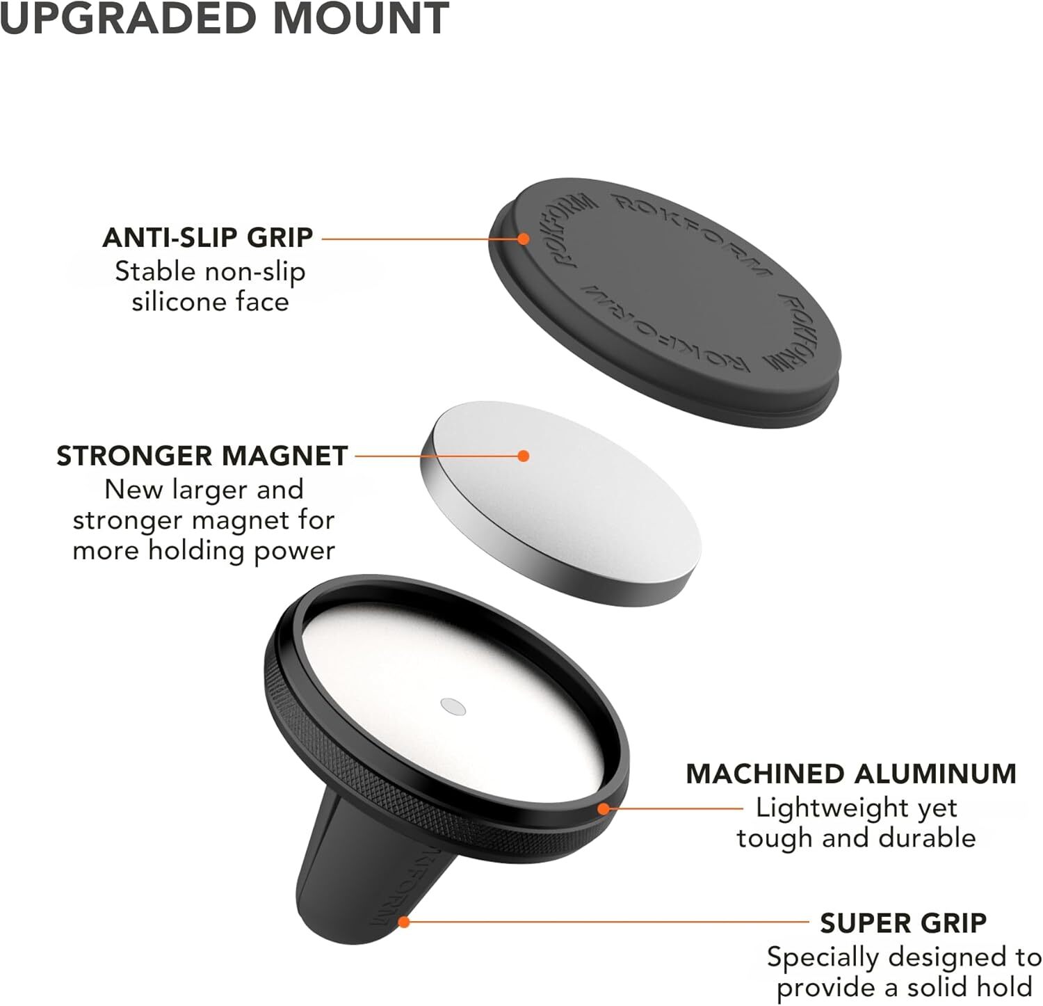 BEST PRICING FREE SHIPPING HIGH QUALITY Magnetic Air Vent Mount Super Grip Car Truck Van Vent Clip Aluminum Cell Phone DETAILS MAGNETIC AIR VENT MOUNT: The air vent car and truck mount is CNC Machined out of 6061 T6 Billet aluminum and Super Grip Silicone Face to ensure your smart phone doesn't shift when mounted. MAGNETIC MOUNT FUNCTIONALITY: Simply slide this mount to any car, truck, or jeep air vent and mount your magnetic Rokform case. Once mounted, your smartphone can be viewed in portrait or landscape mode (360 Degrees) with zero sliding. AIR VENT MOUNT COMPATIBILITY: Compatible with all Rokform Magnetic Cases, but also includes 2 metal plates, enabling universal mounting capabilities for any smartphone or smartphone case. MAGNETIC TECHNOLOGY: Specially designed Neodymium magnet will not negatively impact your GPS, credit cards, Wi-Fi, Apple Pay, Bluetooth, camera or data transfer. ROKFORM WARRANTY: We offer a 2-year warranty on our entire catalog, along with 5-star customer support. If you have any issues with your purchase, please let us know, and we will fix it! Shipping Shipping Policies: We ship to the Lower 48 States only (Does NOT include Hawaii or Alaska) We cannot ship to PO Boxes/APO's We cannot combine shipping. No Local Pickup. Payment & Return PAY SAFE: PAYPAL PAYMENT IS ACCEPTED We offer a 30 day return policy. Your satisfaction is guaranteed! If for any reason you are unhappy with your item, just return it within 30 days for a full refund, minus shipping cost. Please contact us prior to initiating a return so that we can issue you a refund authorization. DELIVERY TIMES Domestic lower 48 free shipping is expedited. We have many different shipping locations depending on the product you buy and the shipping location that you choose. We try to ship most items within 24 hours of payment Monday-Friday. Most orders are in transit for two days but some may take longer. If you have a specific time frame please contact us before you make the purchase. For Shipping to Alaska, Hawaii & Puerto: Delivery times may vary. Usually it takes around 5-7 days to ship your item, but it can take up to 15 days in some special cases. Feedback 100% satisfied customers. It says it all. BEST PRICING FAST SHIPPING HIGH QUALITY