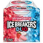 Contains eight (8) 1.3-ounce tins of ICE BREAKERS DUO Strawberry Flavored Sugar Free Mints in a box Keep a container of delectable strawberry flavored mints in the car, a pocket or a drawer for instant refreshment Cool, strawberry flavored ICE BREAKERS DUO mints are packaged in a dual-sided puck you can take with you anywhere for all-day access Use ICE BREAKERS mints for filling birthday gift bags and school lunch boxes or bridal and baby shower candy dishes ICE BREAKERS DUO sugar free mints with cooling crystals and a strawberry flavor, perfect for your Halloween, Christmas, Valentine's Day and Easter candy selections ICE BREAKERS DUO strawberry flavored sugar free mints with cooling crystals deliver a blast of fruity deliciousness. These bulk mints are conveniently packaged in pucks the perfect size for popping into your mouth whenever you're ready for a fruity, strawberry flavored mint. ICE BREAKERS DUO strawberry flavored red and white mints are ready to be your go-to whenever you want to freshen up your breath. After breakfast, lunch or your morning or midday coffee, pop one of these treats into your mouth for immediate coolness and a refreshing strawberry flavor.