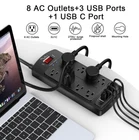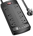 - 【 Power Strip with 8AC outlets & 4 USB 】 - power bars with surge protector with 8AC outlets & 4 USB charging ports (1 USB C Outlet), 6 Feet Heavy Duty extension cord(1625W/13A), surge protector (2700 Joules) with overload protection protects against spikes and fluctuations. Wide range voltage design, can be used on 120v to 240v circuit. - 【 USB- C Fast & Smart Charge 】 - 4 USB ports total 3.4 A, each USB A port features 2.4A Max output. USB C charging port features 3A MAX. Built- with smart technology, detecting charging devices and deliver optimal charging speed automatically, compatible with most USB devices. NOTE: The UCB-C port doesn't support any other devices which need 14~22V charging voltage. - 【 8AC Surge Protector Outlets 】 - The 3 level complementary Surge Protector Circuit which composed of TVS (transient voltage suppressor), MOV (metal oxide varistor), GDT (gas discharge tube), with minimum 2700 Joules energy absorbing capacity, could protect your devices much more quickly and reliably than other brand’s 1 level MOV Surge Protection Circuits. - 【 Safety and Certificate 】 - ETL safety certified, with extension cord and other major components certified by UL. The over current protection switch limits the power strip's working current to certain setting, so it will not get hot during usage. Environmental protection and fire-resistance PC shell with flame retardant at 1382 ℉ makes it more durable and longer lifetime.