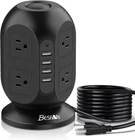 Surge Protector Power Strip Tower with 10 Ft Cord, 8 AC & 4 USB Ports 12 In 1 Power Strip Tower: This power strip with USB ports features 8 widely spaced AC outlets and 4 USB ports, allowing you to charge up to 12 devices simultaneously without obstruction, ensuring an organized workspace. Advanced Surge Protection: Equipped with smart IC technology, this device automatically detects connected devices and delivers optimal charging speeds. Each USB port provides up to 3.1A, making it perfect for fast charging of smartphones, tablets, and laptops. 10 FT Extension Cord: The UL-listed surge protector is constructed with heat-resistant PVC housing and 100% copper wiring, ensuring safety and reliability. The 45° right angle plug design prevents outlet blockage, while the extended cord allows for flexible placement away from walls. Comprehensive Safety Features: This power strip is designed with multiple safety protections, including 1050J surge protection, 1250W overload protection, 1382℉ overheat protection, and short-circuit protection, safeguarding your valuable devices against power surges and overloads. Space-Saving Vertical Design: The innovative 4-sided vertical design of this charging station allows you to charge multiple devices while keeping your desk tidy. It is ideal for use as a desk organizer for home office supplies, office accessories, and dorm room essentials. 12-IN-1 Tower Surge Protector Power Strip with USB 10 Ft Extension Cord with Multiple Outlets This versatile power strip tower is the ultimate solution for all your charging needs, perfect for home, office, or college dorms. With 12 widely spaced AC outlets, you can conveniently charge multiple devices at once without the hassle of blocked plugs. Featuring 4 USB charging ports, this power strip offers additional charging options, making it ideal for powering up your phone, laptop, tablet, camera, and more. The smart IC technology ensures that your devices are charged at their fastest possible speed, enhancing efficiency and convenience. Key Features of the BESFAN Power Strip 12-in-1 capacity with 8 AC outlets and 4 USB ports for simultaneous charging. 10-foot UL-listed extension cord for versatile placement. Smart IC technology for optimal charging speeds up to 3.1A per USB port. Robust surge protection and safety features to protect your devices. Compact and space-saving design for a clutter-free workspace. Package Content 1 x Surge Protector Power Strip Tower 1 x User Manual Space-Efficient Design The vertical tower design minimizes desk clutter while providing easy access to all outlets. High-Speed USB Charging The built-in SMART IC technology intelligently detects and delivers the fastest charge for your devices. Quiet Operation Designed to operate silently with a gentle LED indicator light, making it suitable for bedrooms and quiet spaces. 10FT UL-Listed Cable The extended cable allows for flexible placement, ensuring your devices can reach the power source without hassle. Sturdy Base Equipped with non-slip pads, the base ensures stability even when heavy adapters are plugged in. Built-in Surge Protection This power strip features built-in surge protection to safeguard your devices against unexpected power spikes.