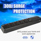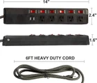 Features: 5 AC outlets and 2 USB ports with 6 power switches, meet your needs for electrical charging in life and work. Surge protector (300 Joules), all-around for your connected devices and appliances. The 14AWG 6-foot power cord and the hanging holes on the back can easily fix the patch board to the desired position. SGS Certificated, aluminum alloy casing, high temperature and corrosion resistance for service life. Max load: 15A 120VAC 1800W 60HZ, USB: 2.4A 5VDC (in total), cord length: 6 feet, outlet distance: 1.4", gross weight: 4.2 lbs (2 pack). Specification: Color: Black Surge protector: 300 Joules Max load: 15A 120VAC 1800W 60HZ extension cord length: 6’ Item Size: 14"L x 2.4"W x 1.6"H Item Weight: 1.8lbs Quantity: 2