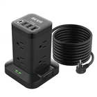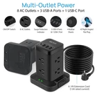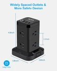 【Extension Cord with Multiple Outlets】 This surge protector power strip tower has 8 outlets, and 4 USB ports which include 1 USB-C port. Wide voltage design of 100V-250V and 10A heavy-duty extension cord. 5V/2.4A max output per USB-A port, 5V/3A max output from USB-C port( 5V/ 3.4A in total). 【Dorm Room Essentials & Power Cube】 With the vertical design, it does not take up too much space like a normal power strip when you need to connect multiple devices. The space between the two adjacent AC outlet is 1.57 inches which is large enough for you to plug in 2 big plugs and no longer worry about plugs blocking each other. This power strip tower surge protector makes your desktop more tidy. 【Surge Protector Tower & All-Round Protection】 Power strip surge protector has passed FCC certification. With 700 joules surge protection, this USB power strip tower can protect your electronic devices against voltage fluctuations or current fluctuations, such as lightning, spikes, and surges. The reset/off switch with circuit breaker will automatically cut power to protect the devices in case of overcurrent/overcharge/short-circuit/overheating etc. 【Stable Base & Fireproof Material】 The width of the base is bigger than the power strip, which makes it more stable. Even big adapter will keep balance. Moreover, 4 rubber feet of the bottom keep it from slipping and sliding. This surge protector power strip is made of fireproof material ABS+PC whose temperature resistance can reach 1382°F (750°C), Provide safe and reliable power for your home electronic. 【Long Extension Cord & 45° Flat Plug】 Adopting the 18AWG extension cord, the rated current of this charging station outlet tower is 10A. The 6.5 FT extension cord adopts high-quality 100% pure copper wire material to ensure better heat dissipation and conductivity. The 45° right angle flat plug can be plugged into the socket behind the sofa without blocking bottom socket.