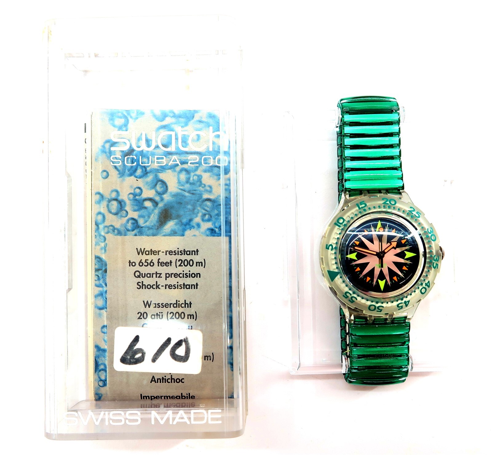 NEW Swatch Scuba 200 Watch MINT DROPS SDK108/109 w/ Case & Papers 1993 Gents NOS This eBay listing is for a New Old Stock classic SWATCH WATCH that comes as you see pictured in the listing and noted above. This watch is brand new and never used before and comes with the original case and paperwork. If you collect classic Swatch Watches, then please check out my other listings in my ebay store for many more great Swatches!! I just picked up close to 800 NOS Swatches from a local auction where I'm told the consignor had one of the largest Swatch watch collection in the United States. This was their 3rd and final auction of Swatches. In total, I purchased close to 1500+ Swatches!! Many of the watches are Special Editions, Limited Editions, Boxed Sets, Scarce and rare models plus other vintage Swatches as well. I will remove all of the old Swatch batteries and will replaced them with brand new batteries to verify that they are all are all in good working condition unless noted below. Please note that vintage and retro Swatches are on the smaller size compared to modern style watches. Most standard Gents (mens) watches have a 33mm-34mm case. I will try to include a picture with each new listing showing the watch next to a standard ruler so that you can see the true size of this collectible Swatch watch. Swatch name : MINT DROPS Model : SDK108/SDK109 New Battery : Yes (due to age, the original battery was removed with a new battery installed) Features/Notes : Works Great! Circa 1993. The size noted on the Stretch band is L for Large. NOTE: there is a small crack in the plastic storage case that this Swatch comes inside on the side. The Swatch is still in mint/unused condition. Seller Location Reference - Box 71A BID IN CONFIDENCE – CHECK MY FEEDBACK! My goal is your satisfaction. I leave positive feedback right after the payment is received for all orders!! If you plan to leave anything less than positive feedback and 5 stars - please let me know so that I can work out any problems that you may have. I aim to please!! SHIPPING & HANDLING FOR US BIDDERS We ship ASAP upon payment as noted above within 1 business day 99% of the time!! We normally pack up your new treasures 2 - 3 times a day and ship using USPS and Fedex Ground so that you get your items in a timely fashion. As always - there is no charge for local pickup on any of my items!! SHIPPING AND HANDLING FOR INTERNATIONAL BIDDERS Import duties, taxes and charges are not included in the item price or shipping charges. These charges are the buyer’s responsibility. Please check with your country’s customs office to determine what these additional costs will be prior to bidding/buying.” THANK YOU AND HAVE A WONDERFUL DAY!! Powered by SixBit's eCommerce Solution