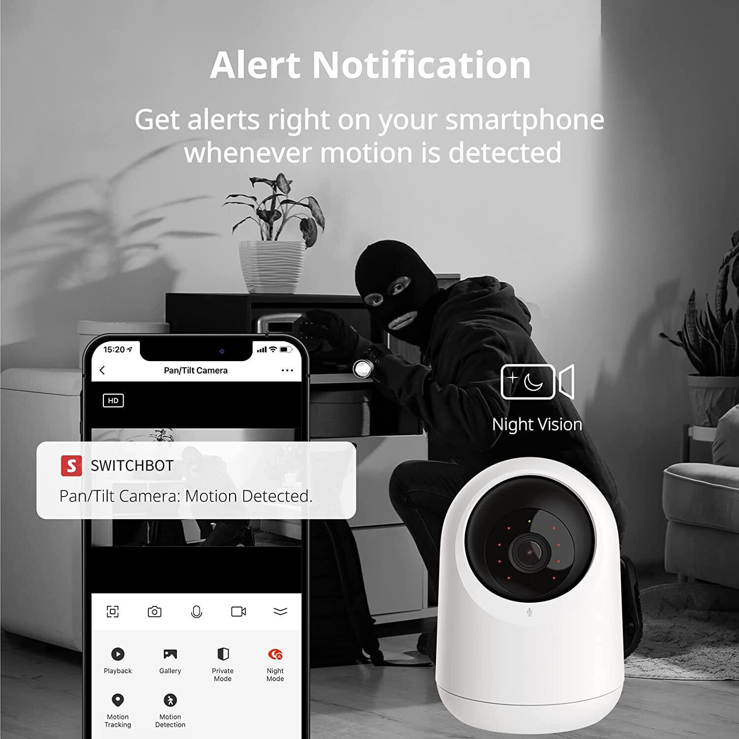 Switchbot Baby Monitor Indoor Camera, 360-Degree 1080P Pan Tilt Smart Wifi Pet Camera DETAILS Clear 1080P Picture - SwitchBot Pan/Tilt Cam displays 24/7 live stream video in full 1080p HD even when mounted in reverse to the ceiling. It can pan/tilt 360° horizontally and 115° vertically. Instant App Notifications - The camera records video when motion is detected and sends an alert to your phone. Using the video playback feature, you can stay on top of things without having to constantly monitor the app. The 8 infrared LEDs allows you to see every detail in darkness. Two-Way Audio - The built-in microphone and speaker allow you to see, hear, and speak to anyone who passes by via the Wi-Fi camera (only support 2.4G WiFi) with live view and two-way audio features. Through the SwitchBot app, you can see who’s at your front door and how’s your baby doing. Privacy Protection - This camera supports up to 128GB SD card local storage (SD card not included) and cloud storage. It transmits data via a secure channel with HTTPS technology, no data will be shared publicly through the Internet and no other devices can access your camera. Works with Alexa & SwitchBot - You can use your voice to control this security camera. Set up with SwitchBot Hub Mini (sold separately), you can also create home automation with other SwitchBot products in hand.
