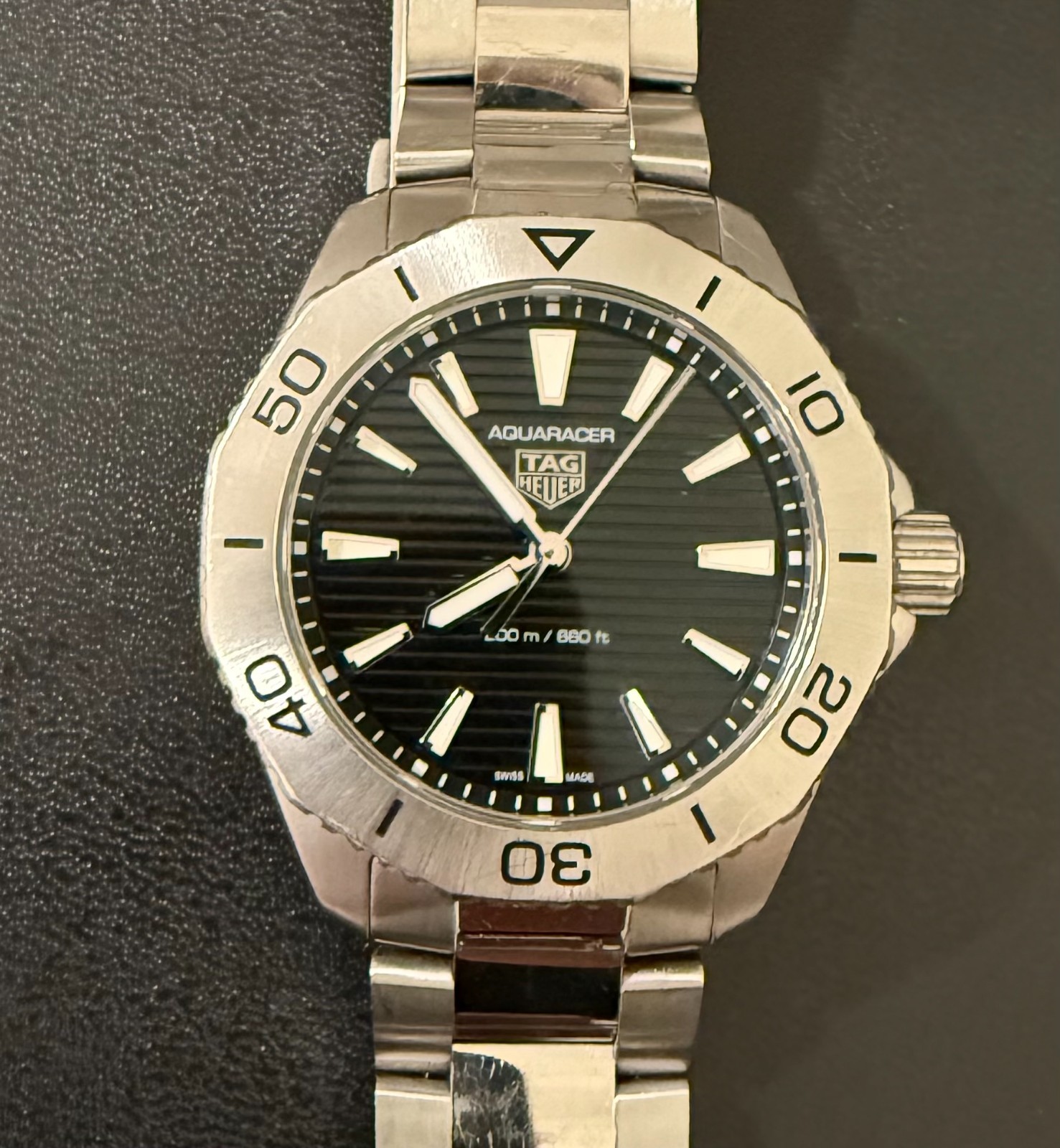 Dial Color: Black Brand: TAG Heuer Hour Hands Color: Silver, White Case Color: Silver Reference Number: WBP1110.BA0627 Display: Analog Bezel Color: Silver Water Resistance: 200 m (20 ATM) Manufacturer Case Color: Silver Closure: Double-Locking Fold-Over Clasp Manufacturer Band Color: Silver Model: TAG Heuer Aquaracer Hour Marker Color: Silver, White Dial Pattern: Teaked Case Size: 40 mm Movement: Quartz Department: Men Band Color: Silver Indices: Baton Indexes Band/Strap: Bracelet Features: Water-Resistant, 12-Hour Dial, Swiss Made Band Material: Stainless Steel Manufacturer Dial Color: Black Watch Shape: Round Case Material: Stainless Steel Type: Wristwatch Caseback: Solid Bezel Type: Unidirectional Rotating