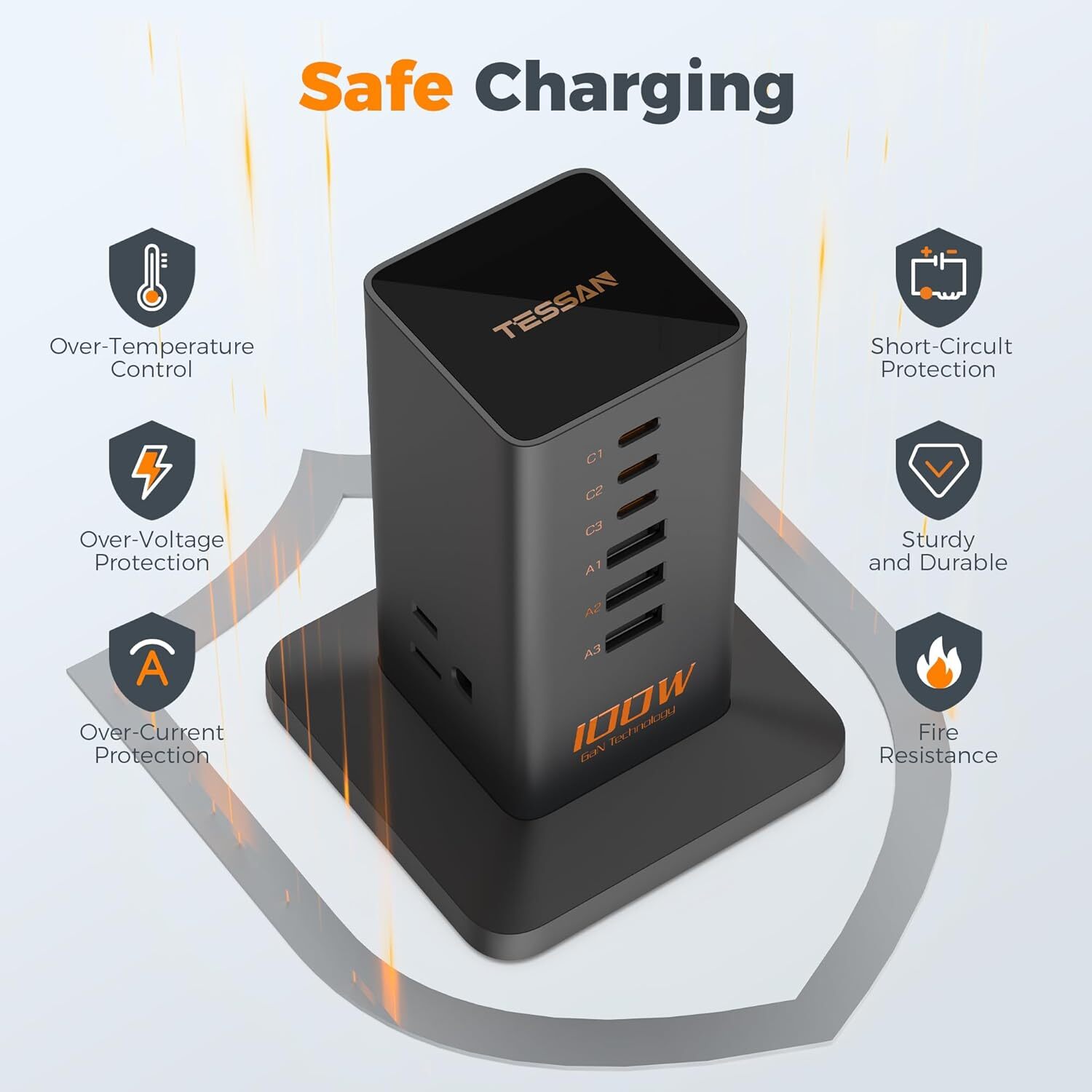 Charging Station PD 100W Fast Charging, TESSAN 9 Outlets, Black-100W with AC Product Details Product Dimensions: 3.35 x 4.72 x 3.35 inches Item Weight: 15.1 ounces Item model number: TS-CS03 OS: Mac OS 9 Connectivity technologies: Powerline Special features: Fast Charging Other display features: Wireless Color: Black-100W with AC Manufacturer: Zhuhai Tessan Power Technology Co., Ltd. Brand: TESSAN Hardware Interface: USB Special Feature: Fast Charging Compatible Devices: Smartphones, Tablets, Cameras, Laptops, Smartwatches 9 in 1 Charging Station: This USB c charger block is a versatile charging solution with 3 AC outlets, 3 USB-C ports, 3 USB-A ports, can charge tablets, cellphones, iphone 14/15 total 9 devices at the same time, creating a neat and tidy desk space for home and office. Space Saving Helper: Vertical design charging blocks takes up little space on your desk and provide 6 charging port for your devices. extension cord with multiple outlets creating a neat and tidy desk space for home and office. Idea for office, college, dorm room essentials GaN Ttechnology: TESSAN usb c power strip for multiple devices built-in GaN chip, charging 5 times faster than ordinary plug, featuring dynamic temperature sensors allows your mobile phone to charge for 10 hours without getting hot, reducing your devices loss PD 100W Fast Phone Charger: Strong protection for over-current, over-voltage, short-circult, grounded protection built in the charging blocks. You can get a safe, sturdy and durable phone fast charging charger to solve your daily charging. One for All: This usb charger outlet extender rated 1250W, could turn 1 socket into 6 USB ports and 3 outlets, meet your various charging needs for cellphone, laptop, tablet, earphone, smart watch, computer, etc