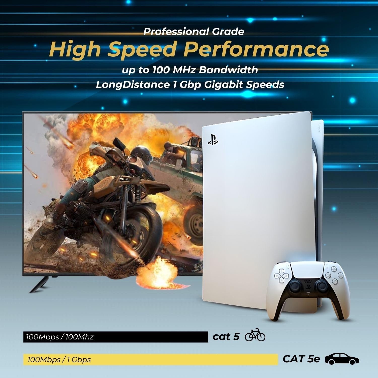 Category 5 cable, commonly referred to as cat 5, is a twisted pair cable for carrying signals. This type of cable is used in structured cabling for computer networks such as Ethernet. The cable standard provides performance of up to 100 MHz and is suitable for 10BASE-T, 100BASE-TX (Fast Ethernet), and 1000BASE-T (Gigabit Ethernet). Cat 5 is also used to carry other signals such as telephony and video. The category 5e specification improves upon the category 5 specification by tightening some crosstalk specifications and introducing new crosstalk specifications that were not present in the original category 5. This versatile Ethernet cable is an ideal companion for gaming, home, office and business needs. Compatible with all devices with RJ45 connector such as internet cable modem, wireless router, IP camera, Xbox One, Xbox 360, PS4, PS3, online gaming, video streaming, smart TV, PC dekstop laptop notebook, macbook pro, printer, gigabit ethernet network switch hub, etc... Specification: Cable Type: Cat5e 4-Pair UTP Connector Type: RJ45 Conductor Material: Stranded Bare Copper Cable Structure: Stranded Power over Ethernet (PoE) and Voice over IP (VoIP) Compliant Package Content: 1x Cat5e Ethernet Patch Cable (25 Feet) - Professional Gold Plated Snagless RJ45 Connector Computer Networking LAN Wire Cord Plug Premium Shielded Twisted Pair (Blue) High Performance Ethernet cable CAT 5 Universal Compatibility - Cat5 8P8C modular RJ45 connectors Ethernet Patch Cable provides universal connectivity for LAN network cables components such as PCs, computer servers, printers, routers, switch boxes, network media players, NAS, VoIP phones, PoE devices, and more Reliable Speed & Connectivity - This cable provides exceptional transmission performance and low signal losses. It supports up to 550 MHz and is suitable for Fast Ethernet, Gigabit Ethernet, and 10-Gigabit Ethernet; Downward compatible with preceding Ethernet standards such as Cat5 and Cat5e Flexible and durable Cat5 cable support high bandwidth of up to 550 MHz guarantees high-speed data transfer for server applications, cloud computing, video surveillance and online high definition Full HD 1080P 4K UHD Ultra HD video streaming, online gaming, etc Reinforced RJ 45 connector - Is with gold that's highly conducive to electrical impulses, further improving the data-carrying capacity of the cord., molded strain-relief boots, and snagless molds resist corrosion, provide durability, and ensure a secure connection; Bare copper conductors enhance communications performance Premium & Quality materials - Solid 24 AWG copper filaments compose the patch cable cord's signal conductors. The twisted pairs are then separated by PE insulation molding that prevents internet cable signal interference. The cable's also gold-plated and made with a molded strain relief