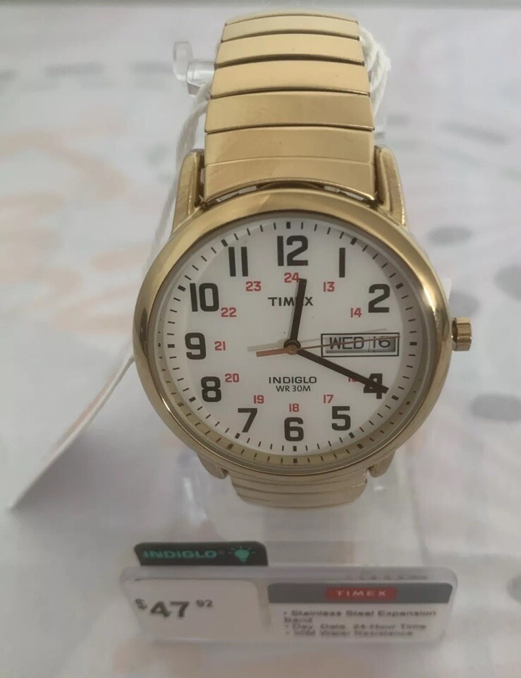 Timex T20471 Men’s Easy Reader Gold Tone Expansion Watch with Indiglo & Day/Date Classic, reliable, and easy to wear—the Timex Easy Reader T20471 is a timeless men’s watch designed for everyday comfort. With its large, clear dial and signature Indiglo night-light , you’ll always be able to check the time day or night. The gold-tone case and expansion band give it a polished look, while the day/date window adds practicality. Features: Model: Timex Easy Reader T20471WF Case Finish: Gold Tone Dial: White with easy-to-read Arabic numerals Band: Stainless steel gold-tone expansion band (comfortable, no clasp needed) Movement: Quartz (battery powered) Functions: Day & Date window at 3 o’clock Light: Indiglo night-light for visibility in the dark Case Diameter: 35mm (classic size) Water Resistance: 30m (splash resistant, not suitable for swimming) Condition: Brand New with Tags Why Buy This Watch? The Easy Reader is one of Timex’s most popular models—simple, durable, and functional. Whether you need a reliable everyday watch, a comfortable dress option, or a gift, this model checks all the boxes.