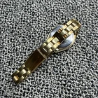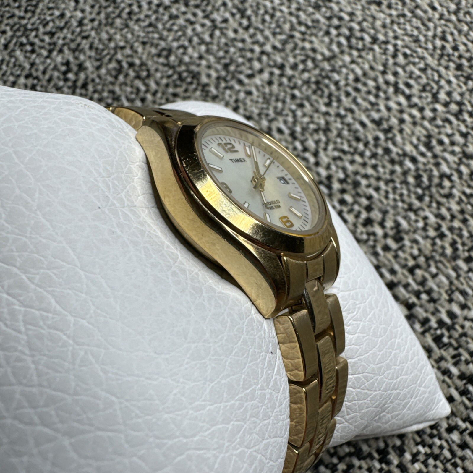 This elegant Timex wristwatch for women features a 25mm gold-tone stainless steel case and bracelet, with a beautiful mother of pearl white dial. The watch boasts quartz movement, water resistance up to 50 meters, and a date indicator. The classic design is suitable for both casual and formal occasions, making it a versatile addition to any wardrobe. The Timex watch also includes Arabic numerals as indices and a 12-hour dial with a gold bezel color. It has been recently fitted with a new battery and is ready to wear. Although it does not come with original papers or packaging, the watch is in excellent working order and is sure to be a cherished timepiece for any wearer.