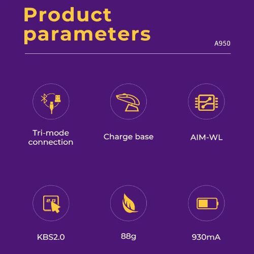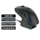 Surface treatment: mimic-skin IC: AIM-WL MCU: CX52850 Micro Switch: 50 million Wired/2.4G: 400/800/1600(default)/3200/6400dpi Bluetooth: 800/1200/1600 DPI (default) Report rate: 1000Hz(wired / 2.4G); 125Hz(Bluetooth) weight: 88±5g Dimension:123*64*39mm Driver:support A950 Tri-mode Gaming Mouse Type-c wired . Bluetooth . 2.4G wireless connect Surface treatment: Skin-like IC chip: AIM-WL MCU chip: CX52850 Micro Switch: 50 million Wired/2.4G: 400/800/1600(default)/3200/6400dpi BT status: 800/1200/1600dpi(default) Tracking speed: 300 IPS Response rate:wired/2.4G status:1000Hz ;BT status:125Hz weight: 88g Dimension:123*64*39mm Driver: support Easy for Charging The mouse is equipped with an exclusive magic color charging base, which can be charged directly on the base by adsorption, which is convenient and fast and is equipped with a variety of RGB lighting, making the desktop streamer beautiful. AIM-WL Sensor The mouse is equipped with a high-performance, low-power optical sensor, which can provide precise tracking of the movement at the micron level, and effectively capture the movement details of each frame. Wireless Transmission Technology 1-millisecond game level 2.4G Wireless transmission technology brings you almost the same status as wired, which can continuously search for and connect to high-quality signals. Ensuring stable and efficient two-way transmission Lightweight Design Originally-designed inner frame, thin but durable housing makes out 88g of weight, which assures more swift movement and better control in fierce gaming, and avoids fatigue after a long time use Built-in Lithium Battery Built-in 930mAh lithium battery, which can be used continuously for 12 days during 2.4G gaming-grade wireless connection. It can be connected to the computer directly through the Type-C interface for charging, and the charging process will not affect normal use. Patented KBS II Key Technology The KBSII (Key Force Balance System) adds a POM shaft device and a float device to the button, which solves the problem of the mouse button idling and has a smaller trigger force, and the high strength and self-lubricating properties of POM allow the button maintains a consistently clicky feel. Warm Tips: If the mode of the 2.4G Wireless can't work . Please operate the mouse as the following steps: 1. Please make sure that the mode of the mouse is 2.4G 2. Download the files via the link as below https://drive.google.com/file/d/1AHQ7TP0l0FmNQofr4Nte18wdVWlqhdij/view 3. Click the file "Gaming pro tool V1.81" 4. Please press the left button, right button and the wheel at the same time for 3 seconds.(Keep your mouse nearly to the USB receiver) 5. Press "enter" in another mouse which can work like picture below