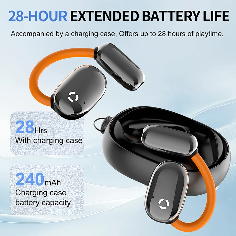 D-72 Open Ear Earbuds Clear Call/Waterproof/Comfort Fit/28H With/Bluetooth 5.4/Open-ear/charging case/Design Multi-scenario use Running/Working/Relaxing/Traveling 28-Hour Battery Life Up to 8 hours of playback on one charge, totaling 28 hours of battery life with the charging case. Bluetooth connection With Bluetooth, the earbuds can be connected directly to your cell phone for convenience. 16.3 Dynamic Driver The earbuds feature large16.3mm dynamic drivers to enhance your music experience. Easy Connection Allows you to connect your headphones to your phone at any time to easily enjoy music, movies or calls. Easy to use headphones with one-touch operation Through the earphone you can directly answerhang up the phone, increase/decrease the volume, play/pause the music. Immersive Stereo Sound Effects Experience immersive stereo sound with the earbuds' large 16.3mmdynamic drivers. Carefully craftedaudio technology delivers rich, dynamic sound that brings your music to life. Easy to use headphones with one-touch operation Equipped with Bluetooth 5.4 technology to provide stable wireless connectivity and reliable audio transmission. Comfortable to wear Open Ear Earbuds adapt to different ear shapes and provide comfort for extended use. Long Standby Time Enjoy 8 hours of play on a single charge, extending to a total of 28 hours with the charging case. Enhanced Privacy Ensures your audio stays private and prevents disturbing those around you. Handheld toy With its unique and innovative design, this earphone is not onlya pair of headphones, but also your personal handheld toy. The rotating parts offer a satisfying way to relieve stress,providing a tactile and engaging experience. A perfect balance of functionality and fun. Wearing Guide Step 1:Prepare your earbuds Step 2:Align the end of the earhook with the top of your ear Step 3:Rotate the earbuds clockwise until the earhook is firmly sited behind your ear Step 4:Adjust its angle and ensure the earbud is tilted upwardto achieve the optimalwearing experience Easy Tap Control Control everything with a tap of your finger so you can leave your phone where it is.