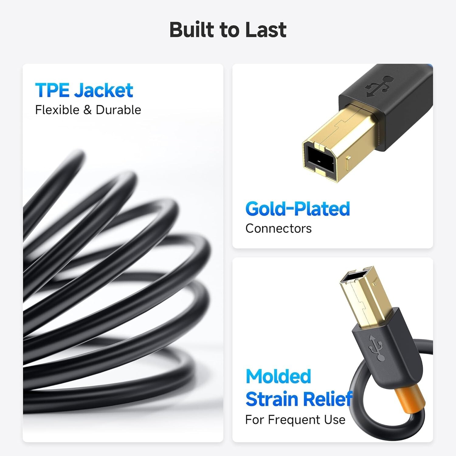 Versatile USB B to USB C Cable: Connect your computer with a USB type C port to legacy devices, including printers, scanners, printer switches, and external hard drives with a USB 2.0 type B port. The reversible USB-C connector ensures hassle-free plugging without worrying about cable orientation. Legacy Device Compatibility: This USB C MIDI cable is perfect for connecting older USB 2.0 printers, scanners, MIDI controllers, and other peripherals to modern USB-C / Thunderbolt 4 Computers. Experience Hi-Speed USB 2.0 data transfer rates up to 480 Mbps for fast, reliable connections. Enhanced Connectivity: A reliable alternative to Wi-Fi connections, this USB-B to USB-C cable is compatible with various devices like MacBook Pro, Dell XPS, and Surface Pro and other Thunderbolt 5 / Thunderbolt 4 laptops. Durable & Shielded Design: Crafted with a flexible cable and molded strain relief, this USB C printer cable is built to withstand frequent use. It features full shielding for superior transmission performance, minimizing EMI/RFI interference. The robust connectors click into place securely, providing a stable connection for reliable data transfer. Wide Compatibility: Compatible with a range of devices featuring USB type B ports, including multifunction printers, desktop scanners, MIDI keyboards, and development boards from brands like Arduino, Brother, Canon, Epson, HP, Lexmark, and more. Ideal for upgrading your legacy setup with modern USB-C compatibility.