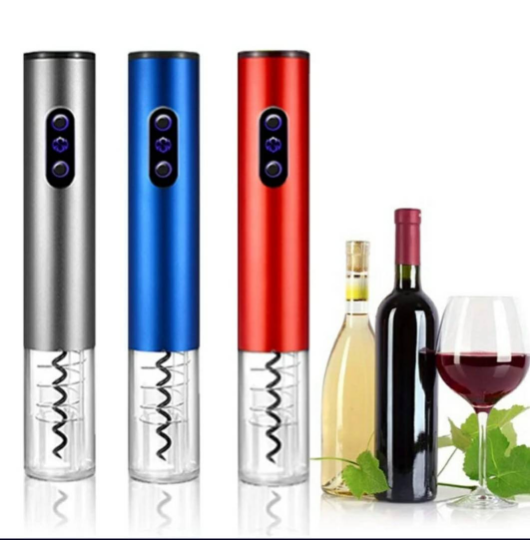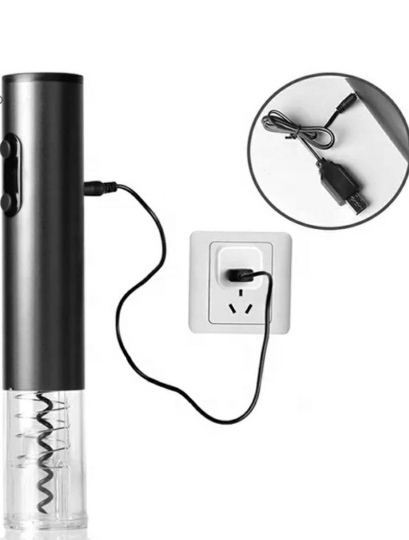 Silver wine bottle opener Rechargeable batteries by USB cable. USB cable and foil bottle top cutter included. Available in silver. Actual wine not included 😉.