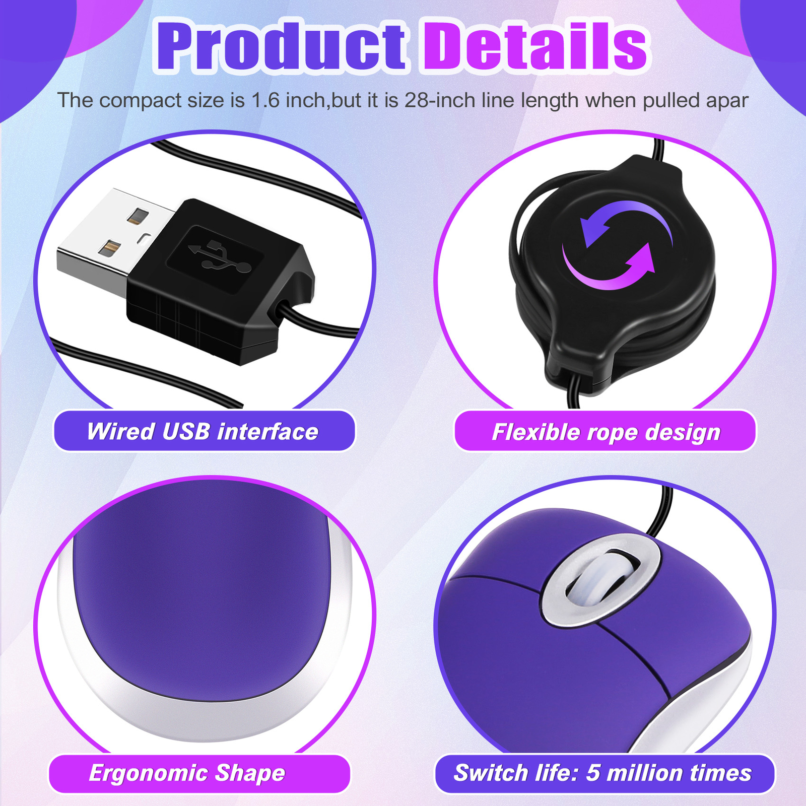 USB Wired Mouse Retractable Tiny Small Mouse 1600 DPI Optical Compact8518 [Mini Size ]Small size, easy to carry, perfect for travel, kids friendly as well. [Retractable Design]The compact size is 1.6 inch,but it is 28-inch line length when pulled apart.Retractable cord enables it to be to be taken wherever desired for use on the computer whether , at work or anywhere else. [3D Technology]High-resolution optical tracking for precise mouse movement. [Plug and Play]No drivers or programs required. Just plug and play.The cord length adjusts and winds/unwinds without tangling or stuck like some other wired mouse. [Wide Compatibility]All 98 / ME / NT / 2000 / XP / Vista / Win 7 / Linux or OS Product Parameters: 1. Product Name: USB wired mouse 2. Cable length: about 80 cm / 31.50 inch (stretchable) 3. Resolution: 1200DPI 4. Type of connection: USB interface 5. Operating voltage and current: DC5 ± 5% Less than or equal to 100MA 6. Flip wheel life: times 7. Switch life: 5 million times 8. Key Specifications: 60 ± 5gf 9. Key operation: 80 ± 20gf 10. Cursor positioning method: photoelectric 11. : 98, 2000, XP, Vista version and so on Colour: Material:ABS Size:76mm*40mm*24mm Package Contents: 1 * Wired Mouse