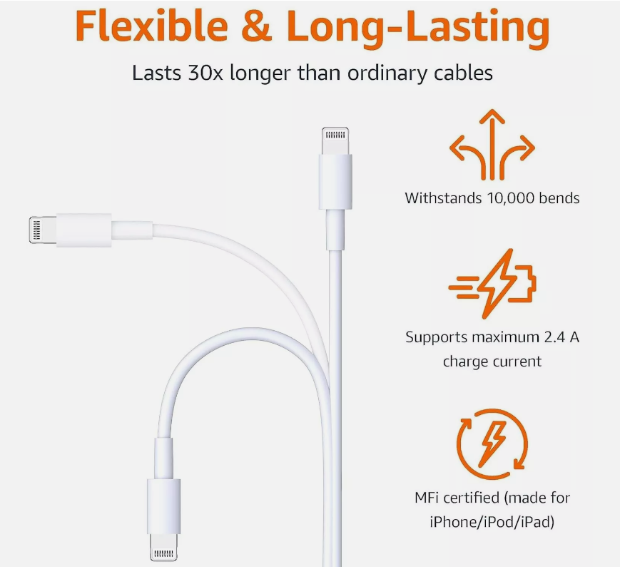 About this item 【Durable iPhone Charging Cable】: iPhone charger fast charging is covered with PVC material, which makes it more flexible and sturdy. Even when bent, folded or pulled, no more worries about frayed or unreliable charging cables 【Ultimate Durability】: The ends feature an innovative, all-in-one rubber design that can withstand over 30,000 bending tests and provides a firm grip when pulling out or inserting into your Apple device 【iPhone Charger Fast Charging】: Apple charging cord is made of high purity and thicker copper wire, which effectively reduces resistance and supports up to 2.4A fast charging and 480Mbps transmission speed 【3 Pack iPhone Charger Cable 3FT】: You will receive 3 packs of iPhone charger cord 3ft. If you own the Lieyichan iPhone lightning cable, you can charge your iPhone or iPad in the car, at the office, and have a spare cable 【MFI Certified iPhone Charger】: 90 Degree lightning cable has been officially certified by Apple's MFI certification. There are no issues charging with any of Apple device including iPhone14/13/12/11/XS/XR/X/8 Plus/8/7 Plus/7/7/6s Plus/6s/6 Plus /6/5s/5c 5/iPad Pro/ iPad Air/Air 2/iPad mini/mini 2/mini 4 /iPad 4th gen/iPod Touch 5th gen/iPod nano 7th gen,iPad