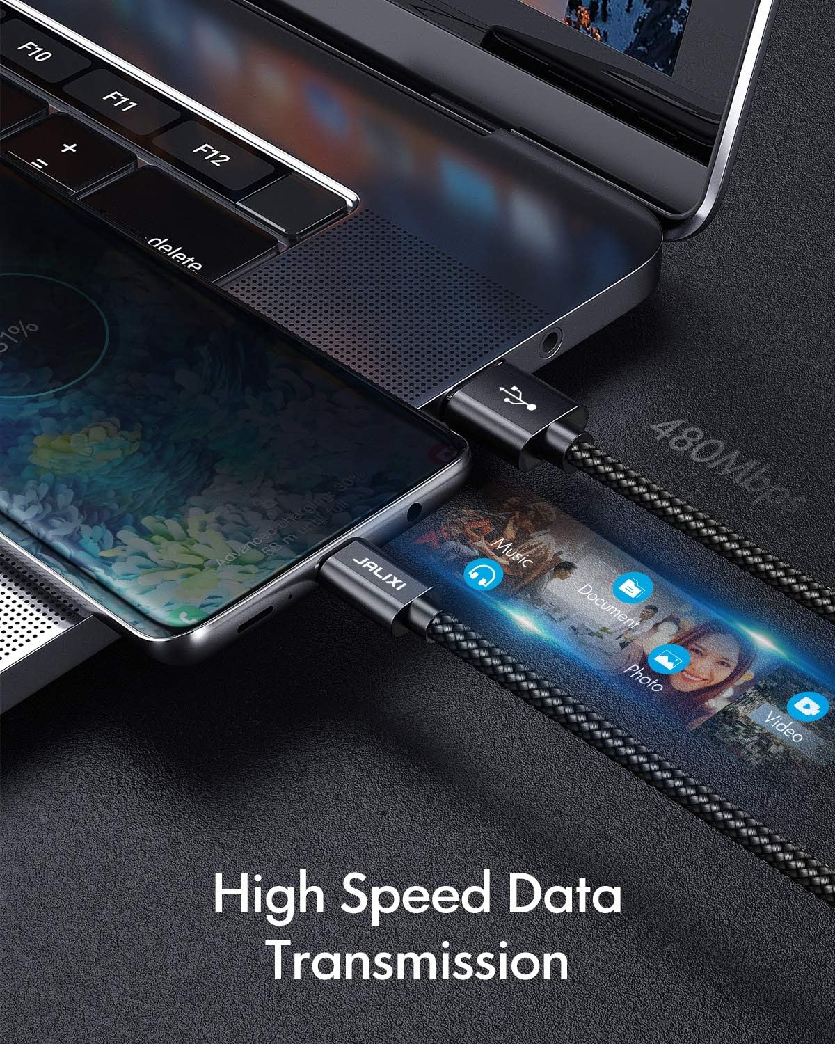 Fast Charging & Sync: The USB C Cable support fast charging up to 15W (3A/5V) and USB 2.0 transfer of 480 Mbps Reliable USB C Charging cable: The USBC Cable has a built-in 56 kΩ pull-down resistor prevents overheating and overcharging, protecting your device from damage Enhanced Durability: The type c cable has military nylon jacket & an extended SR anti-break design at the connector joints to prevent breakage. Reinforced metal connectors to withstand repeated plugging Universal Compatibility: The USB C Cord work flawlessly with any device that uses a USB-C port like smartphones, tablets, camara, game controller What You Get: Nylon Braided USB A to USB C Charger Cable (3 pack 1ft/3ft/10ft, Black). Welcome guide, friendly technical support Product description PRODUCT DETAILS: Brand: JALIXI Color: Black Length: 3 pack 1 ft/ 3ft/ 10 ft Current: Up to 3 A Data-Transfer : These are USB 2.0 to USB C Cable. Transfer movies, music, or an entire photo library in seconds with 480Mbps ( NOTE: This USB C cable does not support media display .) Support Carpay/Android Auto Resistance : Built-in 56KΩ resistor for a reliable charging Bending life: 35,000 + Material: Nylon Braided Cover + Aluminum Alloy Connector Universal Compatibility compatibility list Work with i-Phone 15 / 15 Pro / 15 Pro Max / 15 Plus Work with Galaxy S Series S24 Ultra / S24 / S24+ / S23 / S23+ / S23 Ultra / S23 FE / S23+ / S22 / S22+ / S22 Ultra / S21 / S21+ / S21FE 5G / S20 Ultra / S20 / S20+ / S20 FE / S10+ / S10 / S10e / S9+ / S9 / S8+ / S8 Work with Galaxy Note Series Note 20 Ultra / Note 20 / Note 10+ / Note 10 / Note 9 / Note 8 Work with Galaxy A Series A03s / A12 / A13 / A14 / A15 / A23 / A25 / A32 / A34 / A35 / A51 / A52 / A53 / A54 / A55 / A71 Work with Galaxy Z Flip/Fold Z Flip 5/Z Fold 5/Z Flip4/Z Fold 4/Z Flip3/Z Fold 3 Work with Pixel Pixel 8 / Pixel 8 Pro / Pixel 7 / Pixel 7 Pro / Pixel 6 / Pixel 6 Pro / Pixel 5 / Pixel 4 / Pixel 4 XL / Pixel 3 / Pixel 3 XL / Pixel 2 / Pixel 2 XL / Pixel XL / Pixel C / Nexus 5X / Nexus 6P Work with L-G LGStylo 6/ Stylo 5/ Stylo 4 / Velvet / Velvet 5G uw/ K92 / K51 / K52/K41S /K50S /K51s / K61 / k62 / k71/ Wing 5G / Q61/ Q92 5G/ W30 pro LG /G6/ G7/ G7 ThinQ /G7 One /G7 Fit / G8/G8X /G8 ThinQ/ G8S ThinQ/ G8X ThinQ/ G9 / LG V20/ V30/ V30s ThinQ /V35/ V35 ThinQ /V40 /V40 ThinQ/ V50/ V50 ThinQ 5g/V50s ThinQ/ V60 ThinQ 5g/Q Stylus Reflect / Rebel 4/ Rebel 4 lite Work with Tablets Galaxy Tab S9 Ultra 5G/ Tab S9 Ultra/Tab S9+/Tab S9/ Tab S8+ 5G/Tab S8 5G/Tab S7 FE/Tab S6/Tab A /Tab A7 Work with Tablets for fire HD 10/10 Plus/10 Kids/10 Kids Pro tablet (11th Gen, 2019-2022 Release), for Fire Max 11 tablet 13th generation - 2023 release. for fire HD 8/8 Plus/8 Kids/8 Kids Pro tablet (10-12th Gen, 2020-2022 Release); for Fire 7/7 Kids tablet (12th Gen 2022 Release), Work with i-Pad i-Pad Pro 12.9 inch 6th 5th 4th 3rd, i-Pad Pro 11-in. 4th 3rd 2nd 1st, i-Pad Air 5th 4th generation, i-Pad Mini 6, i-Pad 10 Work with Kin dle for Kin dle Paper white Voyage, All-new Ki ndle/Kids/Scribe (2022 release 11th Gen); fire Kids Pro,Kids Edition (9th-12th generation - 2019-2022 release) for Game Controller Charging PS5 Controller/ Xbox Series X / Series S Controllers / Switch Controller PLEASE NOTE This is a USB-A 2.0 to USB-C Charging Cable. Media Display is Not Supported! How to Achieve Fast Charge? 1: Supports high-speed charging for devices compatible with Qualcomm Quick Charge including Samsung Galaxy S10, Note 8, and more. 2: To achieve fast charge, you need a power block for fast charging and a phone capable of the same 3: Limited charging speed for PD enabled devices