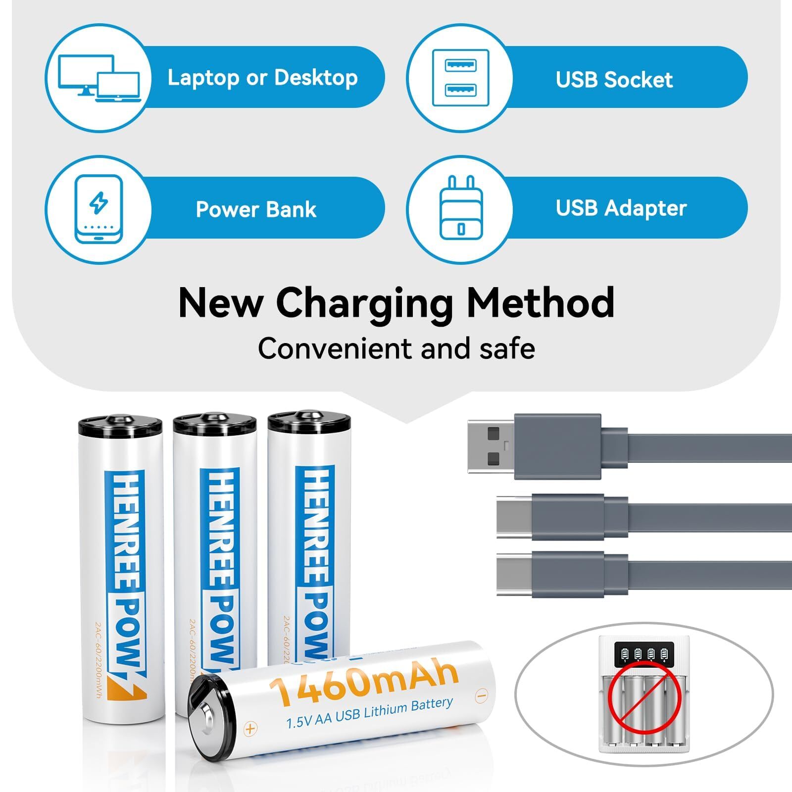 Rechargeable AA Batteries, USB Lithium Double A Battery, 1.5H USB C Fast Charging 1.5V Constant Voltage 1200 Cycle Long Lasting Power Batteries (4 Pack) Ultimate Convenience: 2200mWh rechargeable lithium batteries redefine convenience by offering easy charging through a USB C port, eliminating the need for traditional chargers. With a voltage of 1.5V, they match the performance of disposable alkaline batteries while being rechargeable Versatile Compatibility: Designed in the standard AA battery size, power for clocks, keyboards, electric toys, remote controllers, flashlights, walkie-talkies etc. (Not suitable for Blink cameras and doorbells) Lightning-Fast Charging: Charging with 2-in-1 USB-C cable, charge fully in just 1.5 hours. (Indicator Status: flashes while charging; Stays on when fully charged) Intelligent Protection: Contains a high-quality lntegrated chip that prevents overcurrent, overvoltage, overcharge, overheating and short circuit. (Not suitable for Blink cameras and doorbells) Sustainability and Longevity: Embrace sustainability with batteries that feature a remarkable cycle life of at least 1200 recharge cycles. Beyond environmental friendliness, this longevity ensures a cost-effective solution for users, contributing to both eco-conscious living and long-term savings Shipping We ship within Three business days of payment, usually sooner. We use a selection of shipping services such as UPS, FedEx, USPS etc. We only ship to the lower 48 states, no APO/FPO addresses or PO Boxes allowed. Local pickups and combined shipping options are not provided at this time. Return You can return a product for up to 30 days from the date you purchased it. Any product you return must be in the same condition you received it and in the original packaging. Please keep the receipt. Payment We accept payment by any of the following methods: PayPal Please pay as soon as possible after winning an auction, as that will allow us to post your item to you sooner! Feedback Customer satisfaction is very important to us. If you have any problem with your order, please contact us and we will do our best to make you satisfied. Contact Us If you have any queries, please contact us via ebay. We usually respond within 24 hours on weekdays. Please visit our eBay store to check out other items for sale! Thank you for shopping at our store.