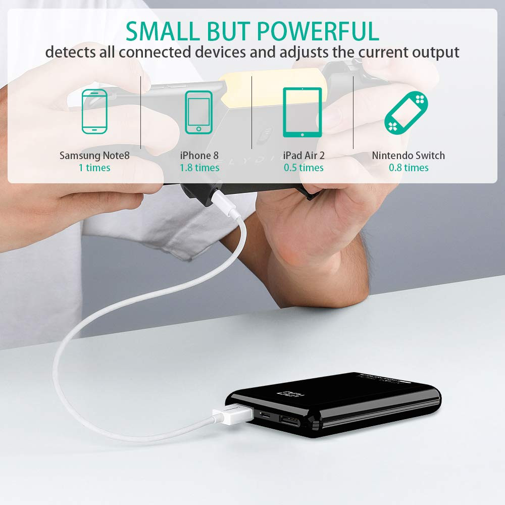 only offers products with best quality and user experiences. Specifications: -Outputs: DC5V-2 A -Capacity: 5000mAh -USB port: 1 Micro USB Package Includes: 1x Smart Power Bank 1x 2A rated Micro USB Cable [Smallest 5000mah Power bank] - Pocket Size 0.5" x 2.5" x 3.7", Light Weight only 3.6 Oz. It's compact size is perfect for every day use. It can be put into pocket easily. [2A Fast Charge Two Devices Simultaneously] - 2 USB outputs to charge 2 devices at the same time. [200% Extended Battery Life] - With this battery bank, you no longer have to worry about your battery life throughout the day and night! This power bank charges most phones 1-2 times. [Ultra Safety] - Intelligent Control Circuit which protects your devices from over-charging, over-current, over-voltage, short circuit and more, ensures your safe and stable charging. This device is also certificated by FCC, CE, CCC, Rohs. [Warranty] - 1 Year