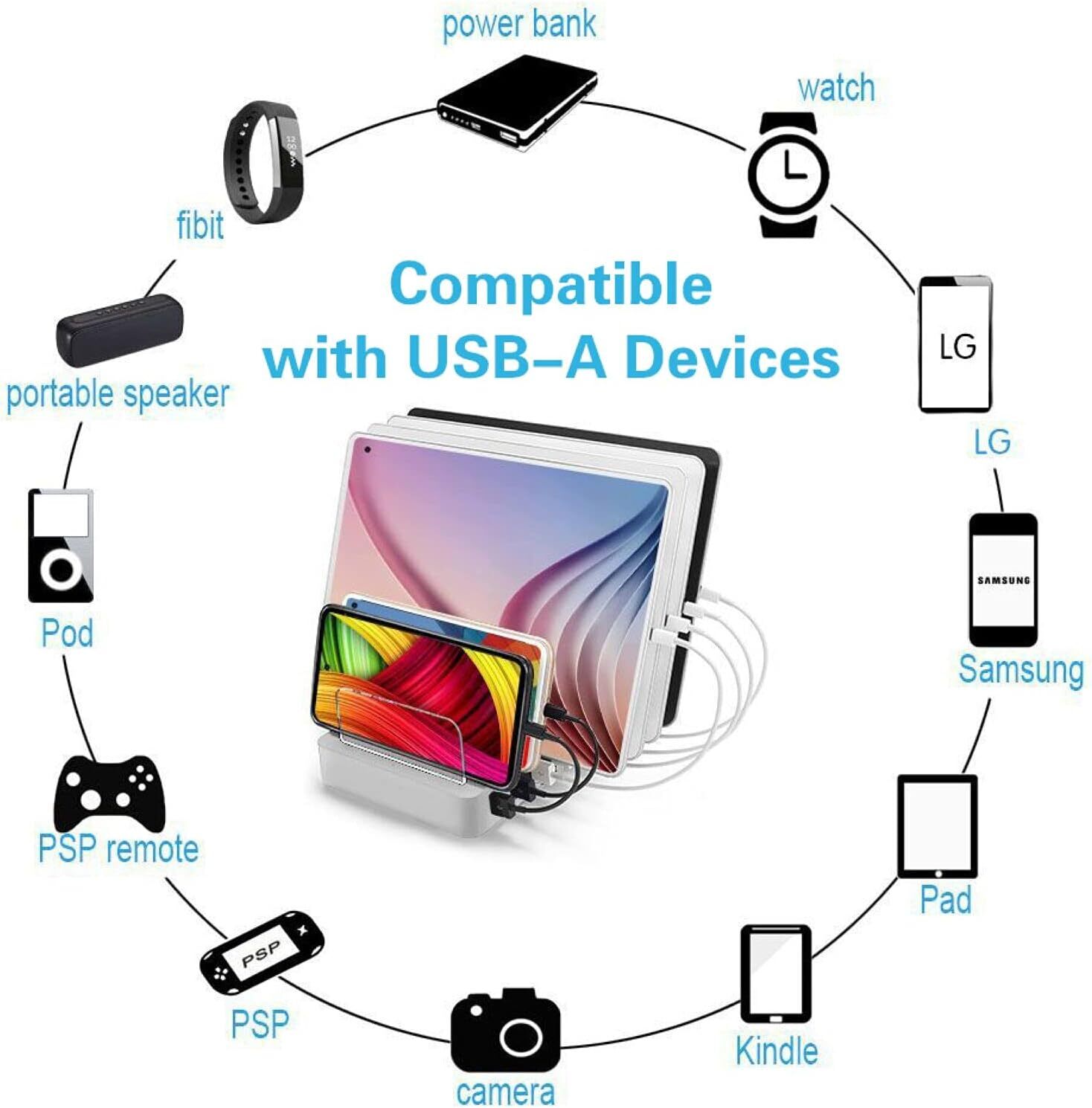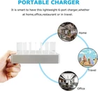 Fastest Charging Station With Qc Quick Charge 3.0 63w 6port Usb Charging Station Fathers Day Gifts, Docking Station & 6 Phone Chargers in 1 Perfect for mum, dad, kids, family, school, hotel, or company use. This USB charger station provides a one-stop charging solution for multiple devices. The white silver USB charging hub works smoothly with iPhone 14 Pro Max, iPhone 14 Pro, iPhone 14 Plus, iPhone 14, iPhone 13 Pro Max, iPhone 13 Pro, iPhone 13, iPhone 13 mini, 12/11/Xs/X/8/7/6, iWatch, Android smartphones, Samsung Galaxy, tablets, Kindle, earbuds—but not USB-C iPad Pro. For iPad Pro, a 105W PD charging station is recommended. Quick Charger 3.0 Fast Smart Charge This charging dock (5 x 2.4A + 3 x 3A) has a built-in Quick Charge 3.0 port, recharging your phone up to 80% faster. Fast charging technology saves time and keeps your devices powered. The other 5 ports provide high-power 2.4A charging for power-hungry devices like tablets and large smartphones. With a smart chipset, the USB hub automatically identifies your devices and delivers up to 9A collectively from all 6 ports. Included 6 USB Charger Cables (23 cm/9 inch), Tidy & Organized Includes 2 iPhone cables, 2 micro USB cables, and 2 type-C cables. Eliminates cluttered cables and the need for multiple chargers on your power outlet. Keeps everything in one place, neat and clean. Innovative Removable Baffler Design Detachable baffles and base can be easily separated. Choose which baffles to leave for enough space to position your devices flat or sideways while charging. Saves space and is easy to carry. Includes 7 baffles and 1 watch holder. Absolute Safety & Protection Equipped with cutting-edge circuitry to protect against short-circuit, over-voltage, over-current, and over-charge. Supports travel-friendly input voltage range of 100 - 240 volts. Built with premium copper wire and high-quality control standards. A memorable and practical gift.