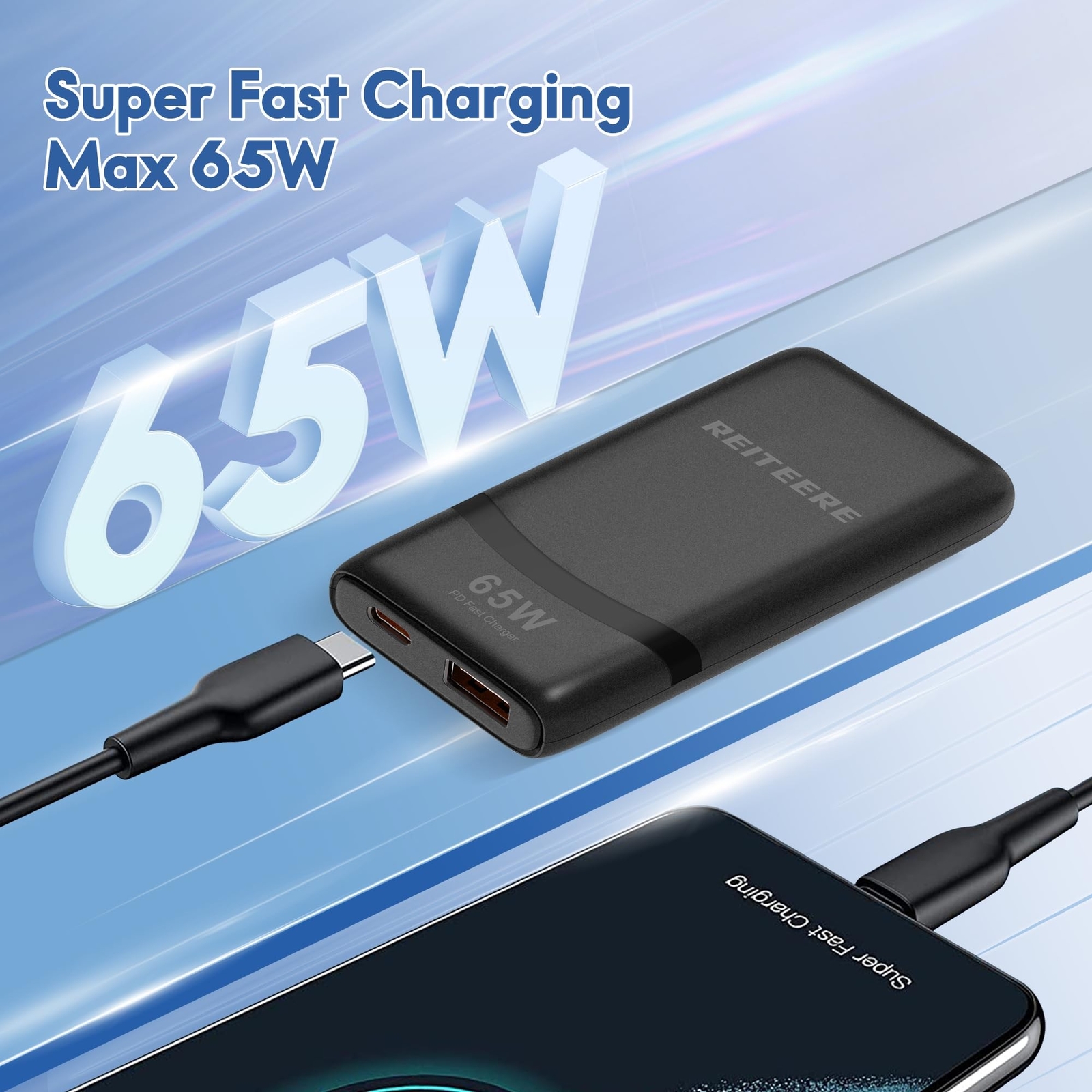 Ultra-Thin 65W GaN Dual-Port USB-C Travel Charger with Foldable UK/EU/AU Plug & 3.28ft Fast Cable | Compatible with MacBook Pro/Air,Samsung S24 (Black) Product Details Color: Black-Cable Brand: REITEERE MPN: RE065AC UPC: Does not apply EAN: Does not apply Brand: REITEERE Connectivity Technology: USB Connector Type: USB Type C, USB Type A Compatible Devices: Headphones, PC, Tablets, Laptops Compatible Phone Models: iPhone 16/15/14 series, iPhone 13 series, iPhone 12 series, iPad Pro Series, iPad Air Series, iPad Series, Samsung galaxy S22 series, S21 series, S20 series, Google Pixel 6 seriesiPhone 14 series, iPhone 13 series, iPhone 12 series, iPad Pro Series, iPad Air Series, iPad Series, Samsung galaxy S22 series, S21 series, S20 series, Google Pixel 6 series See more Included Components: 3.28ft/1m 100W Charging Cable, EU/UK/AU Plug Special Feature: Travel, Fast Charging Color: Black-Cable Input Voltage: 110 Volts Total USB Ports: 2 Product Dimensions: 3.5 x 1.77 x 0.55 inches Item Weight: 7.4 ounces Item model number: RE065AC Date First Available: September 25, 2024 Manufacturer: REITEERE Country of Origin: China Ultra Thin DesignThe 0.55-inch low profile usb wall fast charger takes up less space in your bag,and can be accessed behind most furniture such as couches, beds and night stands to charge devices. 65W Fast ChargingThe 65W USB C charger can access up to 65W of power when using a USB-C port to charge your MacBook Pro 14 to 41%, an iPhone 16 to 50% or a Samsung S24 Ultra to 70% in 30 mins Dual-Port ChargingFeaturing 2 charging ports, a 45W USB-C port and a 12W USB-A port, the Dual port charger allows for simultaneous charging of two devices Latest GaN technology The 65W usb c wall charger uses GaN chips, which not only reduce the size and weight of the USB C charger, but also have built-in protection devices to protect your electronic devices from overcurrent, overheating, and overcharging Travel partner:Foldable adapter, GaN travel charger with EU/UK/AU plugs and 3.28ft 100W charging cable, providing convenience for business trips Universal compatibility65W slim usb c charger supports multiple fast charging protocols,such as PD/QC/PPS/Apple2.4/AFC/DCP/FCP,can fast charging for most laptops,tablets,phones