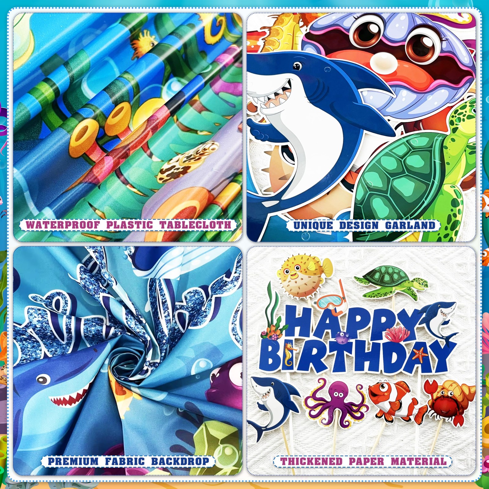 Under the Sea Party Decoration Set -- Ocean blue birthday party decorations include 1 happy birthday backdrop, 1 tablecloth, 1 ocean animal garland, 2 white bubble garlands, 2 foil curtain background, 70 latex balloons, 8 ocean animal foil balloons, 1 cake topper, 12 cupcake toppers, 3 tools kit (balloon chain, glue points, ribbon). Exquisite Design -- The backdrop and tablecloth use underwater world creatures as elements, such as octopus, sharks, whales, turtles, crabs, clown fish, seaweed, coral, etc. The bright colors and vivid watercolor designs add more joyful atmosphere to your party. Reliable Material -- The disposable ocean tablecloth is made of plastic, waterproof and oil-proof, can be thrown away directly after use. The background cloth is made of high quality polyester fiber, strong and reliable, not easy to tear. Natural latex material balloon and high-quality aluminum foil balloon, non-toxic and non-hazardous, not easy to burst. For Any Occasions -- Perfect sea animal party decorations for ocean themed party, shark themed party, mermaid themed party, tropical fish themed party, boys and girls birthday party, also can be used for beach party, pool party, baby showers, summer party decoration, holiday celebration, outdoor picnics and other party decoration. Sincere Customer Service -- We only stock high quality products and strive to offer the highest level of service. If you have any question after purchase, you can contact us at any time, we will solve it as soon as possible. We hope you have a pleasant shopping experience.