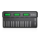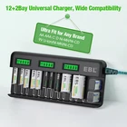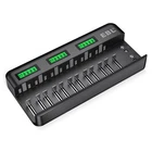 Feature: 12+2 Bay Universal Charger:Up to 14 Different charging slots, allow you to charge 1-12PCS AA AAA or 1-6PCS C D Ni-MH/Ni-CD rechargeable batteries and 1-2 PCS 9V Li-ion/Ni-MH/Ni--CD rechargeable batteries, ultra fit for any brand batteries. Individual 12+2 Charging Slots Battery Charger:Could charge any number batteries without in pairs, to meet the needs of charging your multiple rechargeable batteries. LCD Display Charger with LED Indicator:Rechargeable AA AAA C D Battery charger with smart LCD screen indicates the whole charging process for the AA AAA batteries and C D rechargeable batteries. "CHG" indicates charging. "ERROR" indicates battery damaged or installation error, support battery repair function. LED indicates the 9V charging status, Red-Charging; Green-Fully Charged. AC Power Supply and Excellent Charger in Every Details : Provided with AC Cable, very convenient and easy to use. Professional care in every aspect for providing quality item. Safety Guarantee:Advanced MCU control and -∆V function, over-heat and over-current protection, short-circuit protection, non-rechargeable and defective battery detection. Compatible with : EBL C9036W can charge 1-12 pieces of AA/AAA/Ni-MH Ni-CD rechargeable batteries, 1-6 pieces of C D Ni-MH Ni-CD rechargeable batteries or 1-2 pieces of 9V Li-ion Ni-MH/Ni-CD rechargeable batteries freely. Both types of rechargeable batteries can be charged at the same time. Working Environment Condition Working temperature: 0℃ - 35℃ Storage temperature: -10℃ -50℃ Surface temperature of Charger: 35℃-80℃ Surface temperature of Battery: 25℃-60℃ C9036W - Super Fast Charging Technology Specifications of Rechargeable Battery Charger Input: 100-240V AC 50/60HZ 0.3A MAX Output: C/D: DC 1.2V 1800mA AA/AAA: DC 1.2V 900mA 9V: DC 8.4V 260mA/9V 80mA 1Pcs AA/AAA/C/D Ni-MH Ni-CD Rechargeable Batteries Charging Time Cable: AAA 800-1100mAh: 0.8-1.2 hours AA 2300-2800mAh: 2.5-3 hours C 5000mAh: 2.7 hours D 10000mAh: 5.5 hours 1Pcs 9V Batteries Charging Time Cable: 9V 600mA: 2.3 hours 9V 280mA: 3.5 hours Package Included: 1 x C9036W LCD Charger 1 x AC Power Supply 1 x User Manual