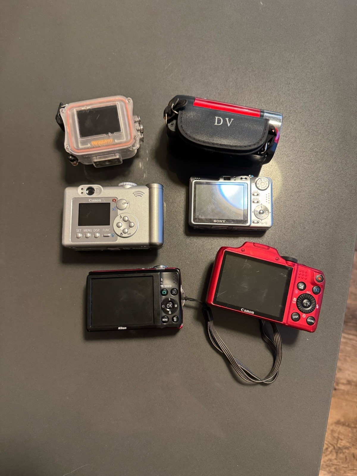 This lot of 6 digital cameras includes models from Sony, Canon, and Nikon, such as the Sony Cyber-shot, Canon Powershot Sx170, and Nikon Coolpix. These compact cameras have digital zoom capabilities, with a 4x zoom for capturing high-quality images. The cameras are in various colors, including red, and offer USB connectivity for easy transfer of photos and videos. While the cameras are untested, they provide a range of features and functions to help users capture memorable moments with ease and convenience. These cameras are UNTESTED. They may work. They may not. They don’t come with batteries or chargers. They are to be sold as is. For parts/ not working