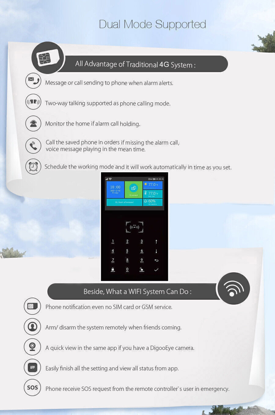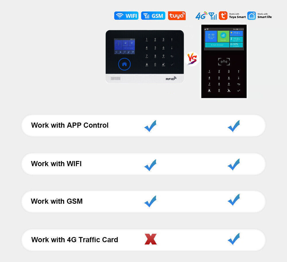 Advantage of 4G alarm system: Australia, United States, Canada has cut the 2G sim card service. And United Kingdom, Mexico, Euro Union, ect will cut the 2G sim card in coming years. Without 2G networks, 2G/GSM only alarm system will fail to achieve it's major function, remote control through calls and SMS. To provide customers with longer alarm system lifespan, our company is launching a series of it's 4G alarm system which are both 4G/3G/2G(GSM) Network compatible. The 4G alarm system will work with United States, Australia, United Kingdom, Euro Union, Canada and most countries' 4G Sim card(Except China, Japan and Korea). The 4G alarm system support use 4G sim card to receive SMS message or phone call to remote control the alarm system(2G alarm system not support sim card function) 4G+WiFi Tuya Home Alarm System Description Payment Shipping Return Policy Feedback Contact Us Description The advantage of 4G alarm system. Because Australia, United States, Canada has cut the 2G sim card service. And United Kingdom, Mexico, Euro Union, ect will cut the 2G sim card in coming years. Without 2G networks, 2G/GSM only alarm system will fail to achieve it's major function, remote control through calls and SMS. To provide customers with longer alarm system lifespan, our company is launching a series of it's 4G alarm system which are both 4G/3G/2G(GSM) Network compatible. The 4G alarm system will work with United States, Australia, United Kingdom, Euro Union, Canada, Mexico, and most countries' 4G Sim card(Except China, Japan and Korea). The 4G alarm system support use 4G sim card to receive SMS message or phone call to remote control the alarm system(2G alarm system not support sim card function). This listed alarm system offers 2 models of 4G sim card module. 1. Alarm system with the most suitable module(1 out of 2) will be shipped based on shipping address unless otherwise requested. 2. For cost saving purpose, you may need 4G Sim Card which only comes with voice and SMS plan(data subscription not required). 3. Sim Card module in each model supports frequencies and ONLY requires you 4G network to work on one of the frequency. Applicable Area USA/Australia 4G alarm system work on United States, Australia, Canada, Mexico, South American, North American. Euro 4G alarm system work on Euro Union, United Kingdom and other Euro countries, Africa, Asia(except China, Japan and Korea). Package Including:(ALL sensor's battery included 4G+WiFi Main Panel(100 Wireless Zone+4 wired zone) * 1 Pcs (Support Connect Amazon Alexa, Google Assistant, IFTTT, etc) Wireless PIR Infrared Detector * 10 Pcs Wireless Door / Windows Sensor * 10 Pcs Wireless Remote Control Key * 4 Pcs RFID Tags * 4 Pcs Wired Siren * 1 Pcs(110dB) Built-in Siren * 1 Pcs(85dB, the siren is built-in main panel) USB Adapter * 1 Pcs English User Manuel * 1 Pcs (NOT Including Sim Card) Frequently Qustion & Answer: Q: What kind of Sim Card support? A: The alarm system is 4G version, it support 4G+3G+2G(GSM) Sim Card, the sim card detailed I have writed in the description. Q: Can this alarm system work with Amazon Alexa or Google Home? A: Compatible with Alexa and Google home: This alarm sysetm works with Amazon Alexa and Google Home for voice control ( Alexa and google home devices not included ). Just ask app Alexa on your phone to Arm / Disarm/ the whole system in a specific instruction like "Alexa, please arm the alarm system". Remote control your Alarm system anywhere in the world with your smart cell phone, no need repeated operation! Q: Can this alarm system work with WIFI and 4G Sim Card together? So if the WIFI failure, can switch Sim Card mode to work. A:Yes. User can connect alarm system with WIFI and 4G Sim Card to work. And when Alarm System be triggered, it will push alarm message to the APP via WIFI. And if the WIFI failure, will change Sim Card mode auto Dial Out. Q: It just with WIFI in my house and without 4G Sim Card,can I use this alarm system? A: Yes. Alarm System can work in WIFI mode only. The alarm system only support 2.4G WiFi, NOT support 5G WiFi. Q: Can I add additional remote controllers, door sensors, pir sensors, smoke detectors, gas detectors or other sensors to work with this alarm system? A: Yes. Alarm system can work up to 99 wireless sensors(wireless freq 433MHz) and wireless Siren, unlimited Wifi Camera. Q: Does the alarm panel with backup battery? A: Yes. Alarm system with internal rechargeable backup battery. It can support work when AC Adapt is cut. Q: What's the function of RFID Tags? A: It used to touch the main panel to arm or disarm soon and easily. Main Function And Feature: 1. 4.3 inch TFT display screen, concise user interface and menu hint design 2. Main interface status bar, date/clock indication, fairly obvious alarm host status. 3. Built-in powerful performance CPU master based on 32-bit Cortex-M3 core 4. Based on u cos C III operating system with multitasking design, great user operation experience 5. WiFi/4G/3G/2G(GSM)/GPRS intranet alarm system, support different alarm channels, like APP push/SMS/voice monitoring/intranet center etc. to ensure the alarm performance stable and reliable 6. Support SMS arm/disarm and voice arm/disarm 7. Support up to 99 learning/storage location for remote control, RFID cards and wireless detector 8. Support many defense zones, such as gate, SOS, bedroom, window, balcony, perimeter, smoke, gas, carbon monoxide, water leaking, etc. 9. Support the main power malfunction, backup power shortage, tamper alarm and other extended alarm. 10 .Support entry/exit zone, indoor zone, perimeter zone, 24-hour zone, etc 11. Up to 5 groups preset alarm phone numbers, SMS on/off and dial on/off can be set respectively 12. Support external wireless siren, Support timing arm and disarm 13. Can store and inquire daily operation records and alarm records. 14. GSM network clock synchronization, to ensure accurate color, and support country time zone setting. 15. Support multi-language menu d
