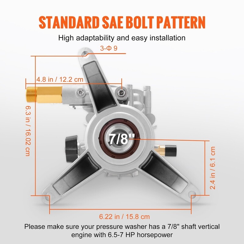 7/8-inch Shaft Vertical Pressure Washer Pump Looking for an easy way to complete your daily and professional cleaning tasks? replacement residential pump is the one you can trust! With adjustable pressure between 2000-3400 PSI, it's perfect for boosting water pressure for your walls, sidewalks, and vehicles. Broad Compatibility Our parts washer pump features a standard SAE bolt pattern for easy installation. It is suitable for various gas pressure washers with vertical engines. Strengthened Plunger Hardness The power washer pump strengthens plunger hardness to reduce the chance of being damaged by impurities. It also improves wear resistance and prolongs the life of water/oil seals. Your Security Comes First Our replacement power washer pump has a thermal release valve for safe use. Once the internal temperature of the pump head exceeds 58℃, it will automatically turn on to cool down. Widely Applicable From outdoor walls, sidewalks, cars, to construction sites, our power washer replacement pump can get the job done efficiently and effectively. It's the go-to tool for all your cleaning needs. No Maintenance Required Our replacement pump for power washer features a maintenance-free crankcase, so you don't need to change the gasoline. Operate with Ease The high pressure washer pump is designed with a simple and fast cold start function, making it easy to start without the need to release pressure before starting the engine. Specifications Item Model Number: KXD1810G Shaft Diameter: 7/8" (22. 225 mm) Engine Type: Vertical Max Pressure: 3400 PSI Max Flow: 2. 5 GPM Horsepower: 6. 5-7 HP Inlet Connector: 3/4" NH Garden Hose Outlet Connector: M22 x 1. 5-14 mm Inlet/Outlet Orientation: Rear Product Weight: 5. 7 lbs/2. 6 kg Product Size: 7. 1" x 7"/18 x 17. 5 cm Package Content 1 x Pressure Washer Pump 1 x Detergent Hose 3 x M8*45 Bolts 3 x D8 Flat Pads 3 x D8 Spring Washers 1 x Shaft Key (4. 78 x 4. 78 x 40) Reborn Your Pressure Washer: Looking for a high-performance pressure washer pump? Look no further than the replacement residential pump! With 3400 PSI max pressure and 2. 5 GPM max flow rate, it's perfect for daily cleaning tasks such as walls, sidewalks, and vehicles. Save money by replacing your pump instead of buying a whole new power washer. Wide Compatibility: Designed with a standard SAE bolt pattern, our parts washer pump is suitable for most rear outlet 196-230cc pressure washers. Prevent Water/Oil Leakage: Say goodbye to impurities damaging your plunger! Our power washer pump strengthens plunger hardness to improve wear resistance and prolong the life of water/oil seals. Maintenance-Free Design: This replacement power washer pump features a maintenance-free crankcase to save the hassle of changing gasoline. This easy-to-install kit is great for power washers that can support 3400 PSI at 2. 5 GPM to wash walls, fences, sidewalks, vehicles, and more. Easy to Start: Our power washer replacement pump boosts simple and quick cold starts to make the startup a breeze. No need to release pressure before starting the engine. Each kit includes a detergent hose, 3 M8*45 bolts, 3 D8 flat pads, 3 D8 spring washers, and a shaft key (4. 78 x 4. 78 x 40). Set up in a few minutes!