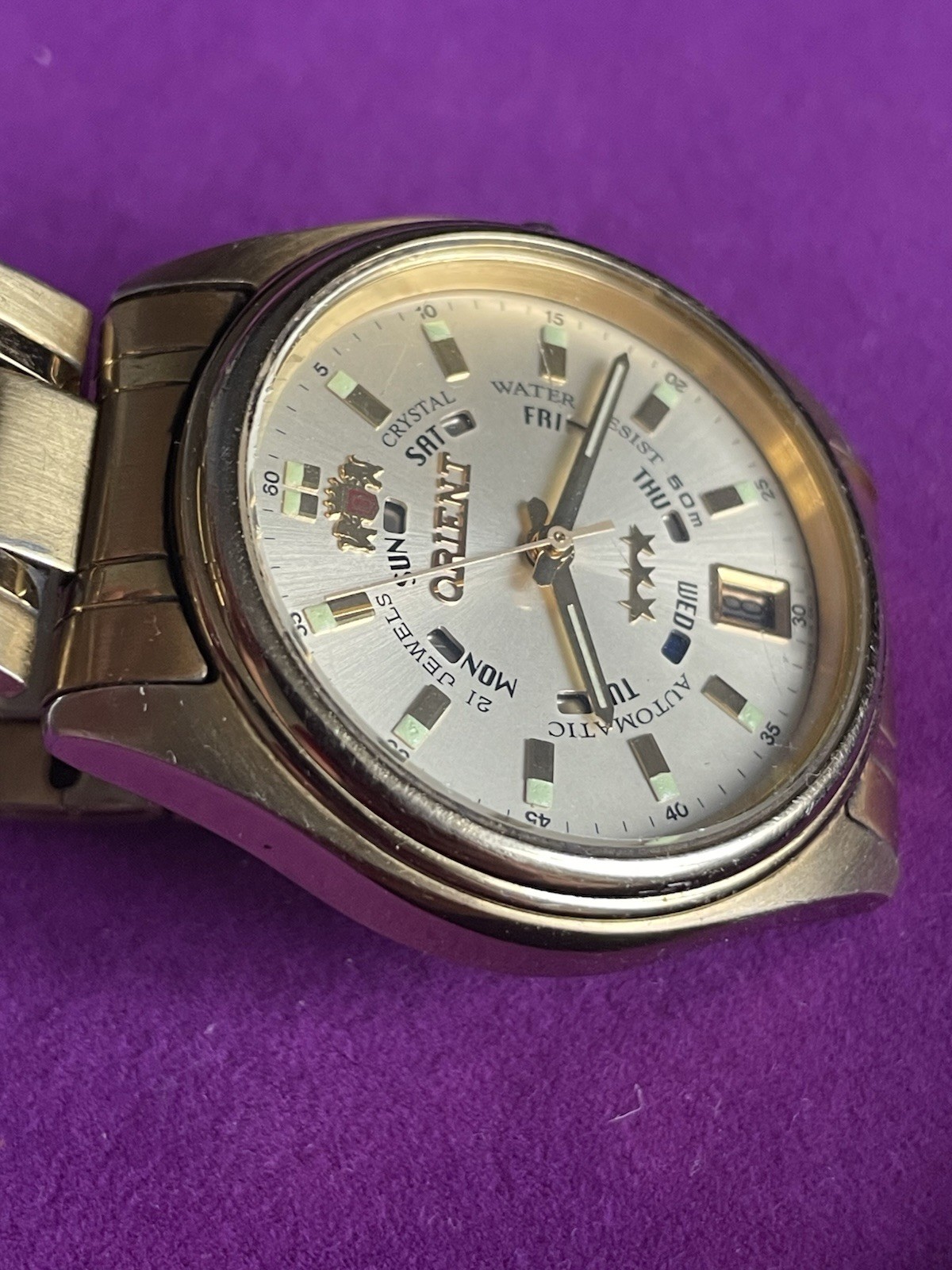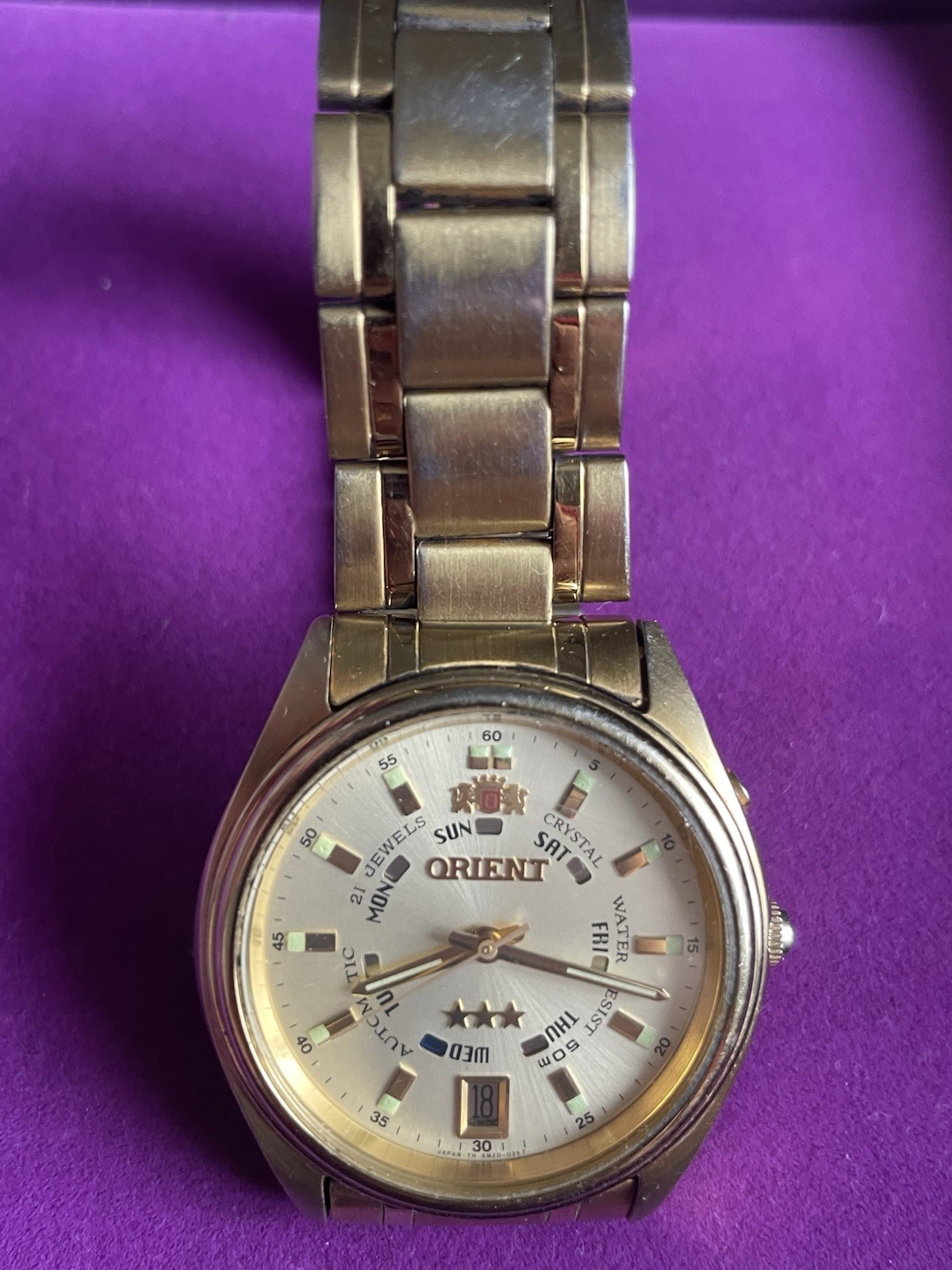 Japan vintage automatic wristwatch Orient EM5J-AO 3 star 21 jewels. The glass and bracelet little scattered. Additional photos on request. Watch is working. See condition on the photo. If you have any questions, please let me know. Transfer to any country. The item(s) will be shipped by UkrPosta Standart AirMail Servise with Track Number.. Normal delivery time to Europe: 7 - 10 days; US: 10 - 14 days; worldwide: 14 - 21 days. Your satisfaction is guaranteed.