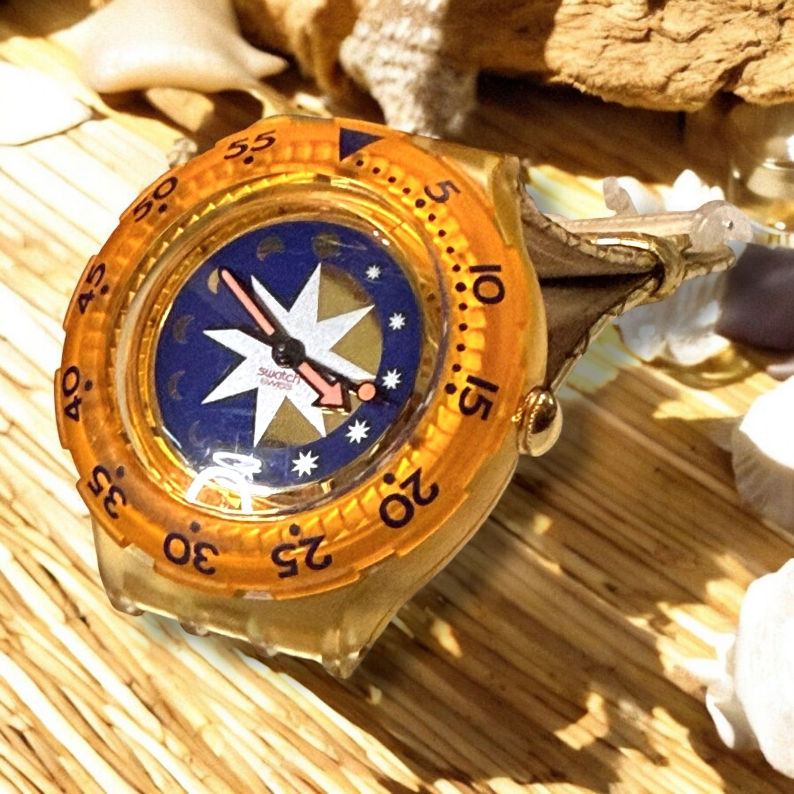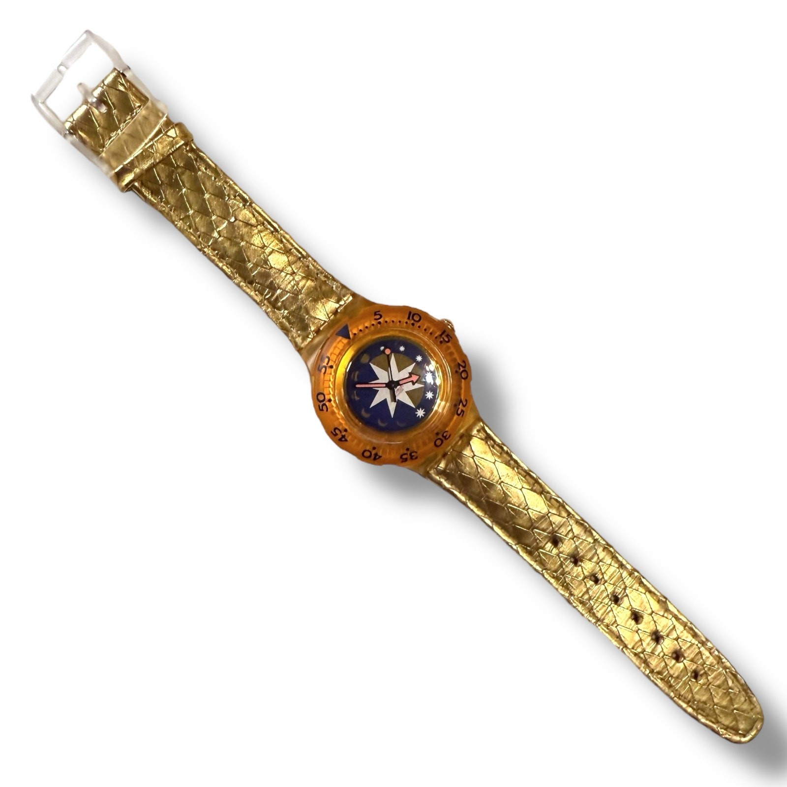 Vintage Swatch Scuba 200 Golden Island model SDK112 Orange Gold Blue Quartz RUNS The watch is in good vintage working condition and ready to wear.