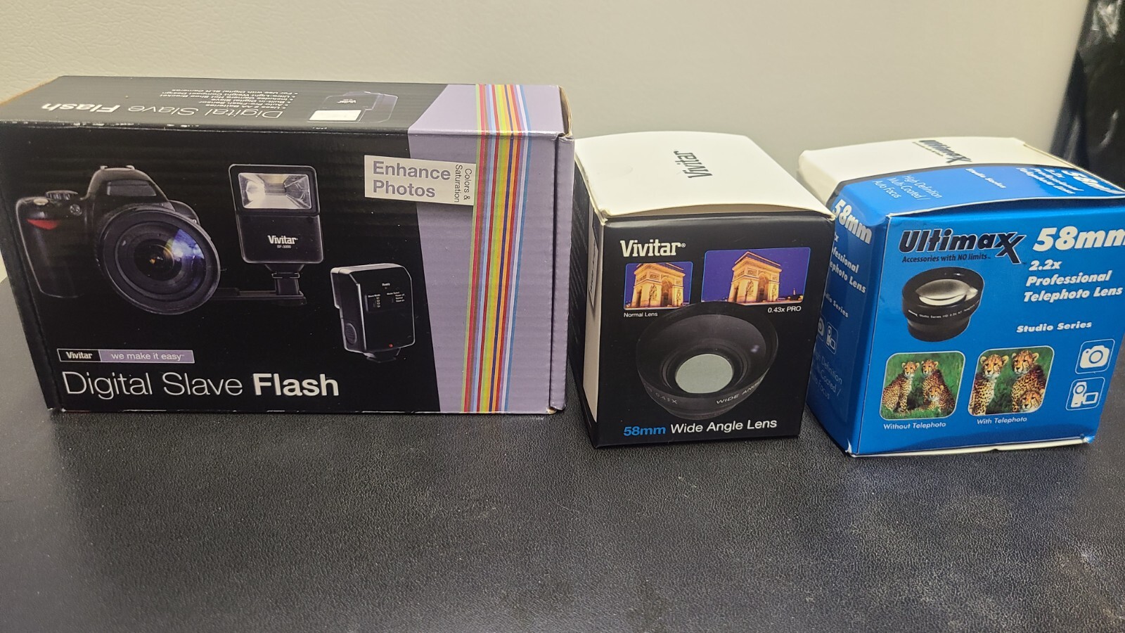 This is a full kit of accessories for a digital camera. All are brand new and total retail value $115. Please read below details: - Samtian Macro Ring Flash RF-600D 18 LEDs Ultra Bright Macro LED Ring Flash for Canon, Sony, Mi Hot Shoe, and other DSLR - TriPod Xit Xt50TRS 50in - Vivitar VIV-SF-3000BX Digital Slave Flash - Vivitar 58mm Lens Accessory Bundle with Two Lens Attachments (Telephoto 2.2X and Wide-Angle 0.43x), 3-Piece Filter Kit and Universal Camera Remote Control