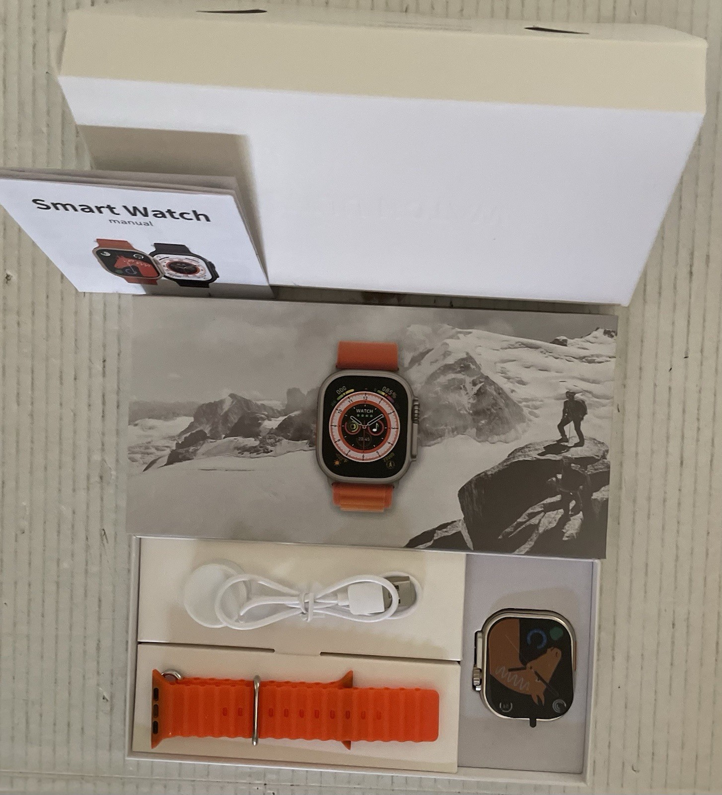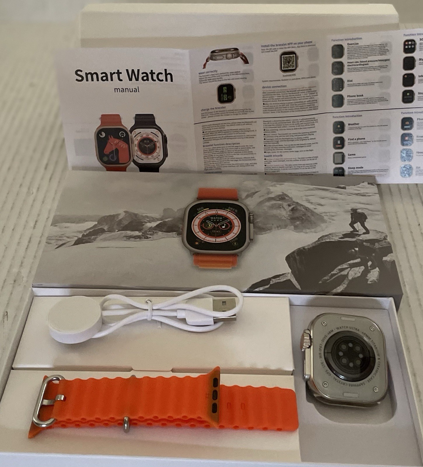 Smart Watch. Says Smart Watch Ultra / 48mm / Titanium and Ceramic Case / Sapphire Crystal / GPS / LTE / WR-IP67-Dive / Orange Band as shown. Open box item. Box may have wear, tear and/or stickers - see pictures for reference.